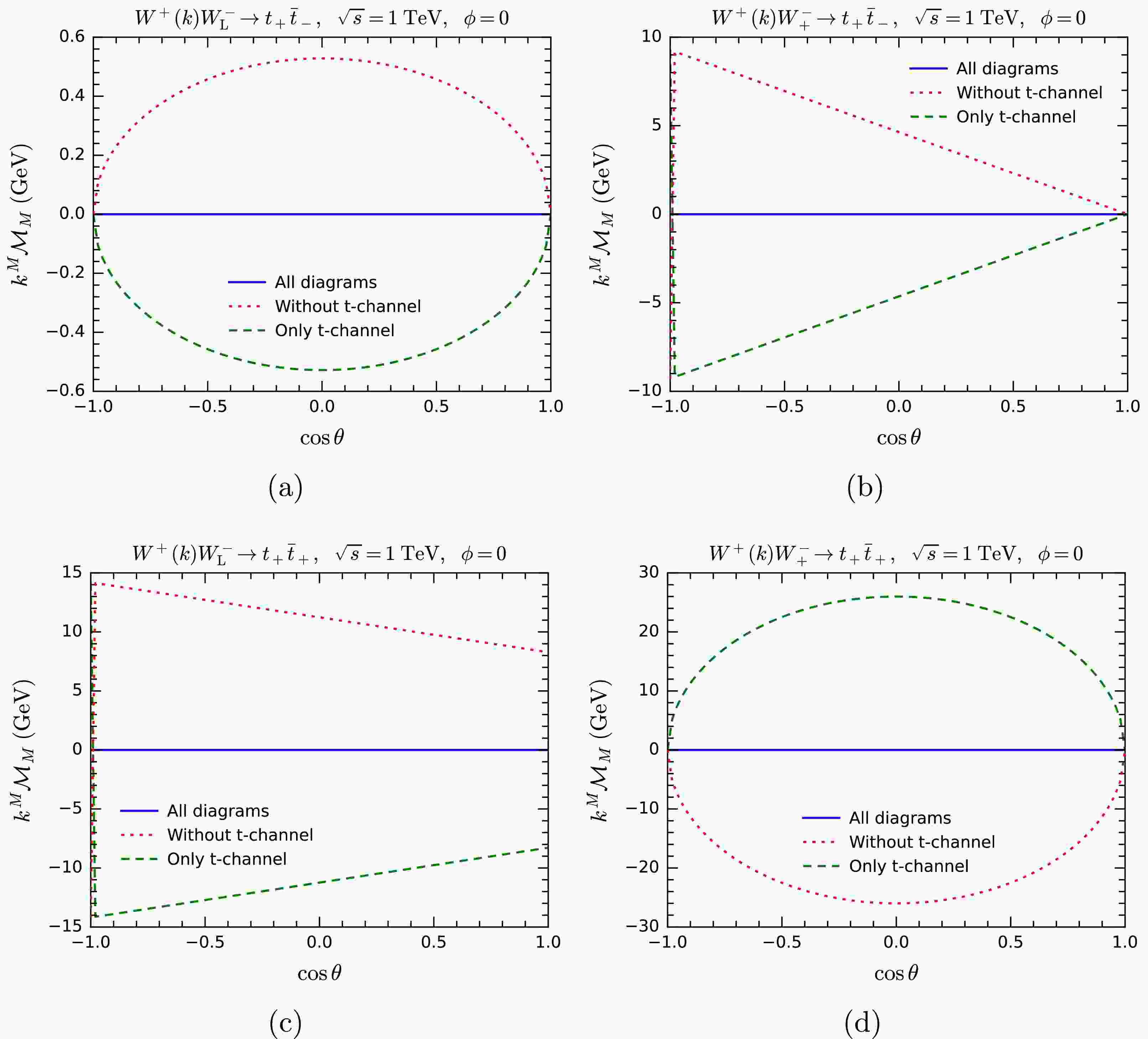 $ k^M{\cal{M}}_M $ for$ W^+ W^-\rightarrow t \bar t $ as a function of$ \cos\theta $ , where θ is the scattering angle in the center-of-mass (CM) system. The CM energy and azimuthal angle are fixed as$ \sqrt{s} = 1\; {\rm{TeV}} $ and$ \phi = 0 $ , respectively. In Figs. 3(a) and 3(b), the polarization vector of$ W^+ $ is replaced by$ k^M $ , with the helicities of$ t\bar t $ fixed as$ +- $ and the helicity of$ W^- $ set to be$ 0 $ (longitudinal polarization) and$ + $ . In Figs. 3(c) and 3(d), the setup is similar, except the helicities of$ t\bar t $ are fixed as$ ++ $ . The blue solid lines represent the results including all tree-level diagrams, demonstrating the MWI$ k^M{\cal{M}}_M = 0 $ . The red dotted and green dashed lines correspond to the results excluding the t-channel diagram and those solely involving the t-channel diagram, respectively. These contributions are precisely opposite to each other, indicating a large and exact cancellation between different diagrams, as expected.