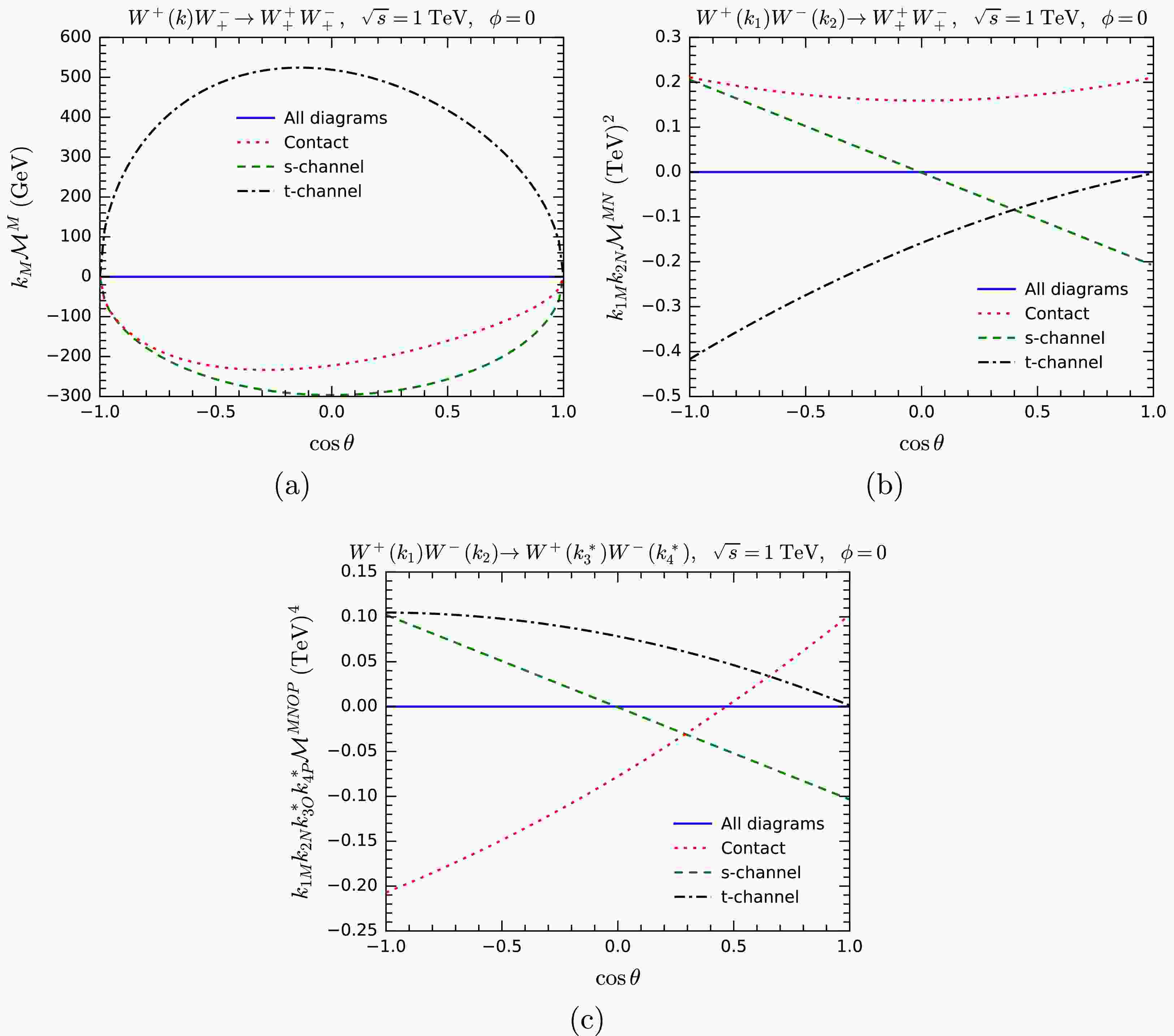$ W^+W^-\rightarrow W^+W^- $ , where one, two, and four polarization vectors of W bosons are replaced by one, two, and four five-component momenta, respectively. The helicities of the remaining W bosons are uniformly set to$ + $ . The blue lines represent the sums of all tree-level diagrams, whereas the red dotted, green dashed, and black dot-dashed lines correspond to the results for the contact, s-channel, and t-channel diagrams, respectively. Once again, we observe that the MWI is satisfied when all tree-level diagrams are included, confirming the gauge symmetry. -