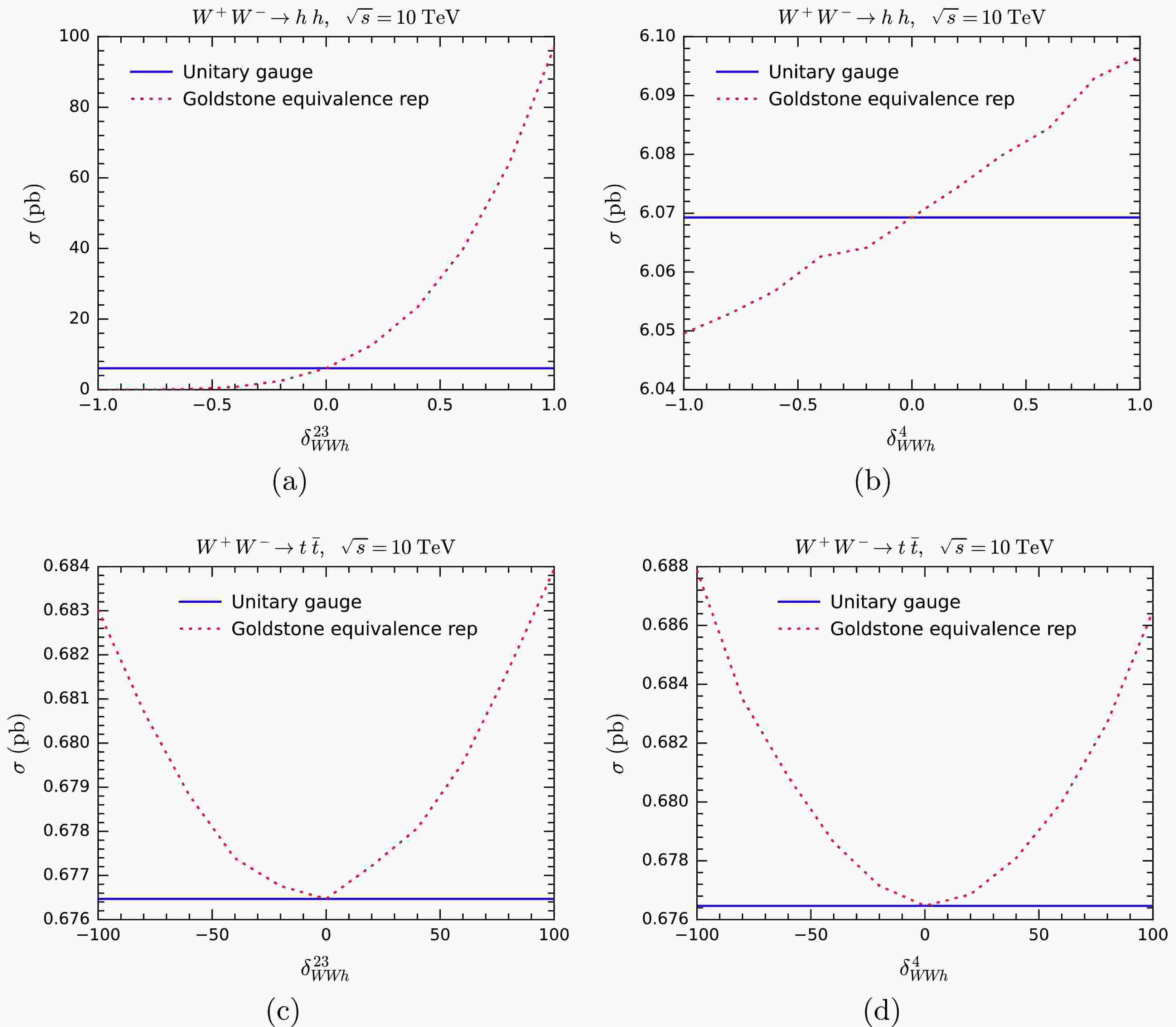 $ WWh $ vertex are$ W^+ W^-\rightarrow t\bar t $ and$ W^+ W^-\rightarrow hh $ . We first compare the cross sections with respect to$ \delta_{WWh}^{23,4} $ in both the unitary gauge and GE representation, and the results are shown in Fig. 5. As expected, when$ \delta^{23}_{WWh} $ and$ \delta^4_{WWh} $ are nonzero, the cross sections in the GE representation deviate from those in the unitary gauge, which remain unchanged and retain the SM values. The larger the values of$ \delta^{23}_{WWh} $ and$ \delta^4_{WWh} $ , the larger the deviations. Compared with$ WW\rightarrow hh $ ,$ WW\rightarrow t \bar t $ exhibits significantly lower sensitivity to$ \delta^{23}_{WWh} $ and$ \delta^4_{WWh} $ . We must plot$ \delta^{23}_{WWh} $ and$ \delta^4_{WWh} $ over the range$ [-100,100] $ for$ WW\rightarrow t \bar t $ but only$ [-1, 1] $ for$ WW\rightarrow hh $ . This is not surprising, given that the$ WWh $ vertex contributes to three channels of$ WW\rightarrow hh $ but only one in$ WW\rightarrow t\bar t $ . Another notable observation is that the sensitivity of the cross section is much higher to$ \delta^{23}_{WWh} $ than to$ \delta^4_{WWh} $ for$ WW\rightarrow h h $ , but the sensitivities are approximately the same for$ WW\rightarrow t\bar t $ .