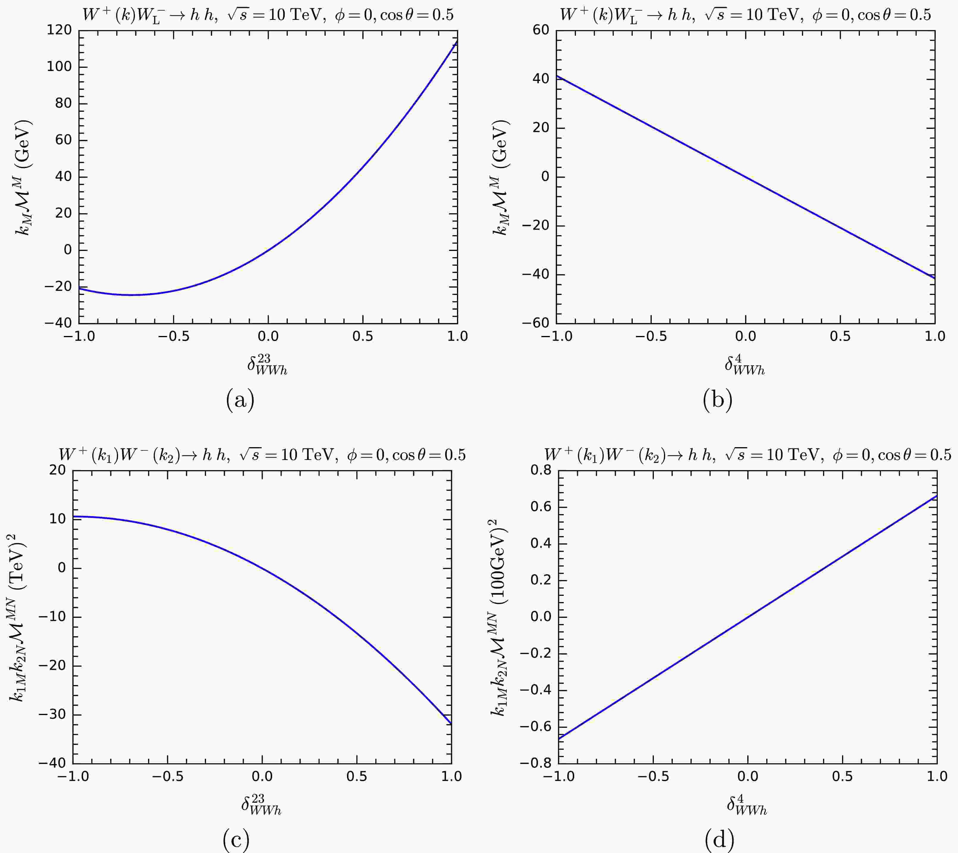 $ k_M{\cal{M}}^M $ and$ k_{1M} k_{2N} {\cal{M}}^{MN} $ as functions of$ \delta^{23}_{WWh} $ and$ \delta^4_{WWh} $ for$ WW\rightarrow hh $ with one or two W polarization vectors replaced by five-component momenta.