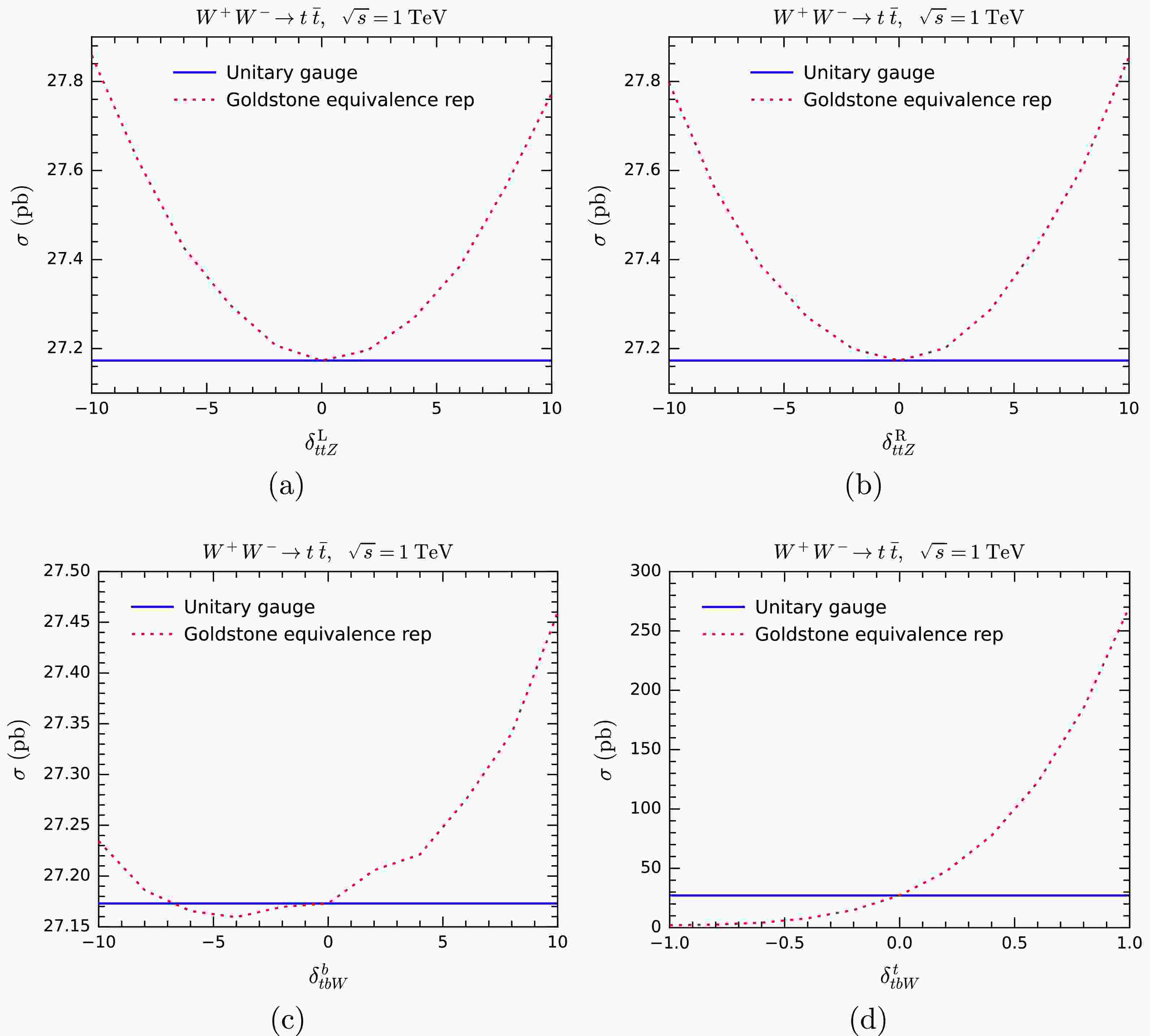 $ WW\rightarrow hh $ (upper panels) and$ WW\rightarrow t \bar t $ (lower panels) at$ \sqrt{s} = 10\; {\rm{TeV}} $ with varying$ \delta^{23}_{WWh} $ and$ \delta^4_{WWh} $ in the unitary gauge (blue solid lines) and GE representation (red dotted lines).Next, we compute