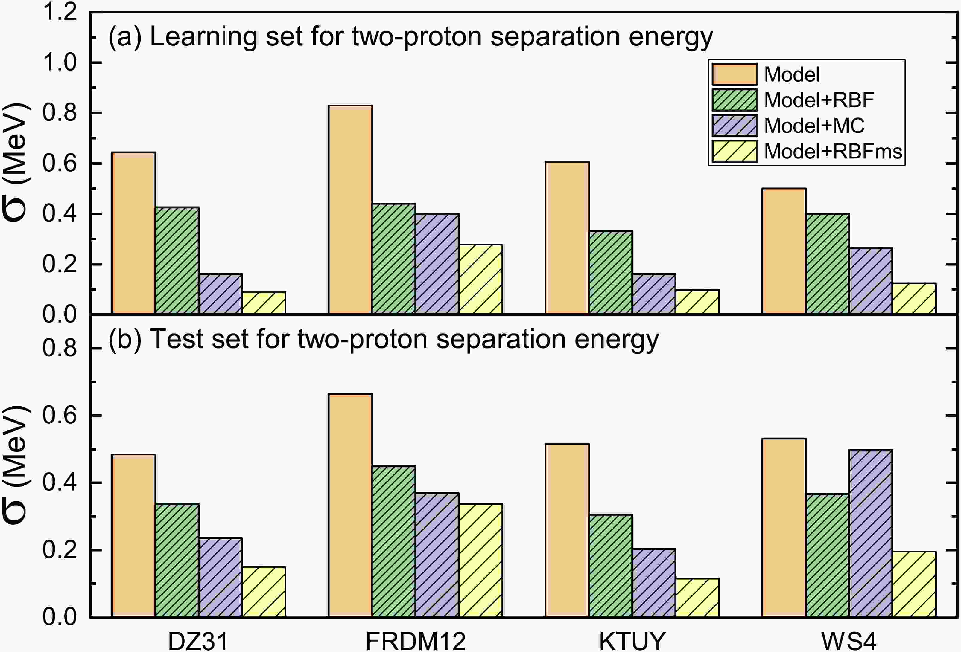 Similarly, we selected 115 nuclei from AME2012 [48] as the learning set for two-proton separation energy, while the test set includes 40 nuclei from AME2020 + NM50 which lie just outside the AME2012. Figure 2 illustrates the rms deviations of the learning and test sets for two-proton separation energy obtained using four nuclear mass models in conjunction with two machine learning approaches and MC method. As can be seen from Fig. 2, for the description of the learning and test sets of the two-proton separation energy, the RBF, MC, and RBFms methods all can improve the results of the nuclear mass model. Among all evaluated methods, the RBFms approach demonstrated the most substantial enhancement in prediction accuracy. Specifically, when applied to the DZ31 model, RBFms approach achieved a learning set rms deviation of 0.089 MeV for two-proton separation energy predictions. The RBFms approach exhibits significantly enhanced predictive accuracy for two-proton separation energy compared to the MC method. This performance advantage, however, is not observed in one-proton separation energy predictions. The observed performance discrepancy may stem from the RBF method's inherent limitations in capturing nuclear odd-even effect induced oscillation patterns, particularly in one-proton separation energy predictions.