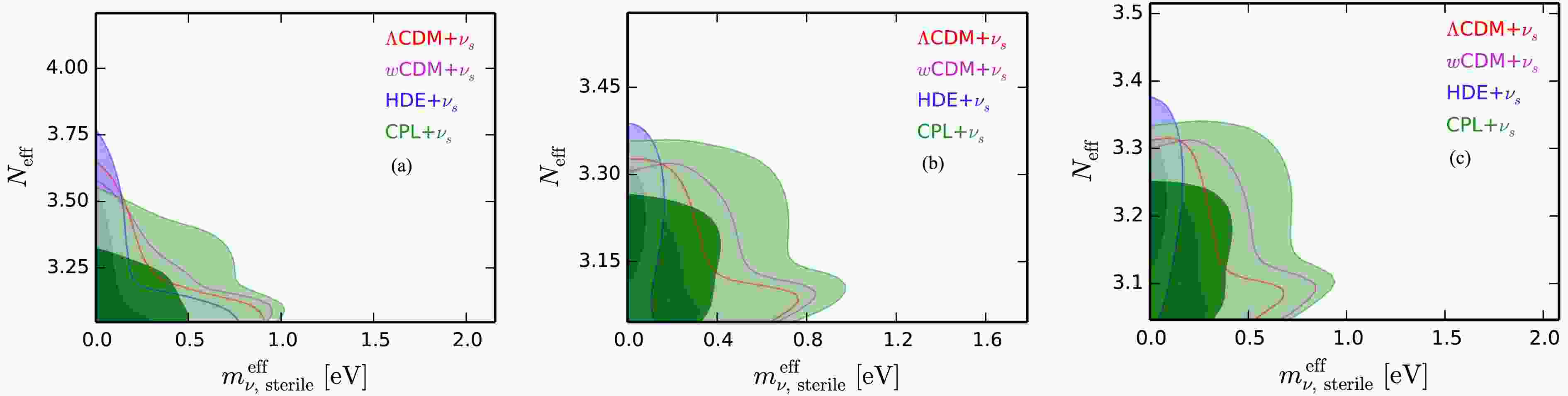 $ \sigma $ and 2$ \sigma $ ) in the$ m_{\nu,{\rm{sterile}}}^{\rm{eff}} $ –$ N_{\rm{eff}} $ plane for the$ \Lambda $ CDM+$ \nu_s $ , wCDM+$ \nu_s $ , HDE+$ \nu_s $ , and CPL+$ \nu_s $ models using the CBS (a), CBS+ET (b), and CBS+ET2CE (c) data combinations, respectively. -