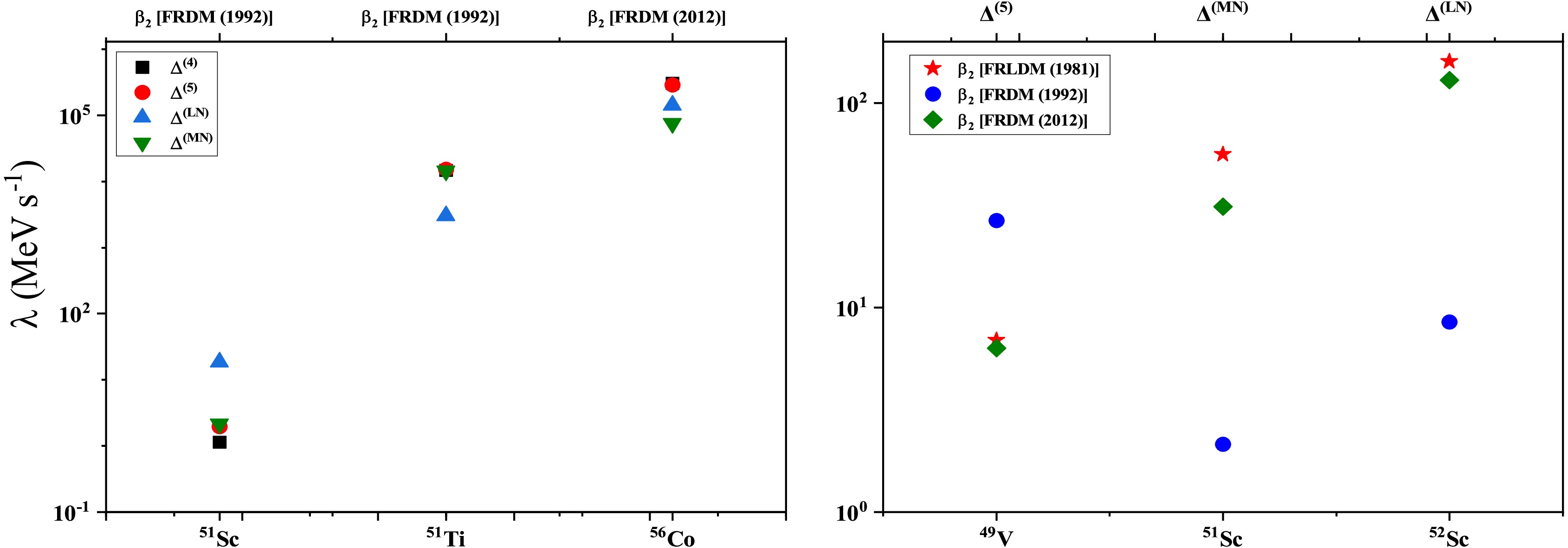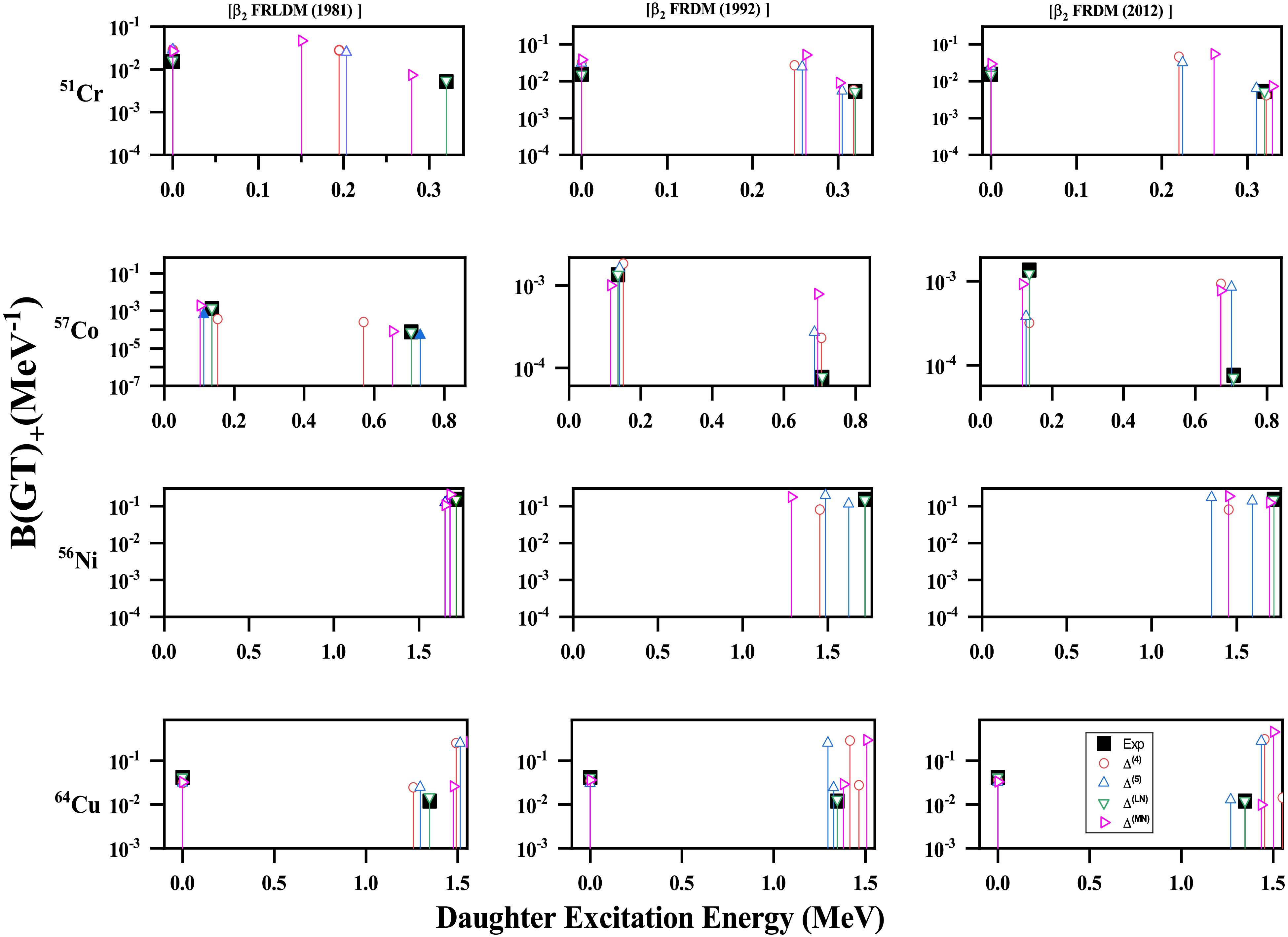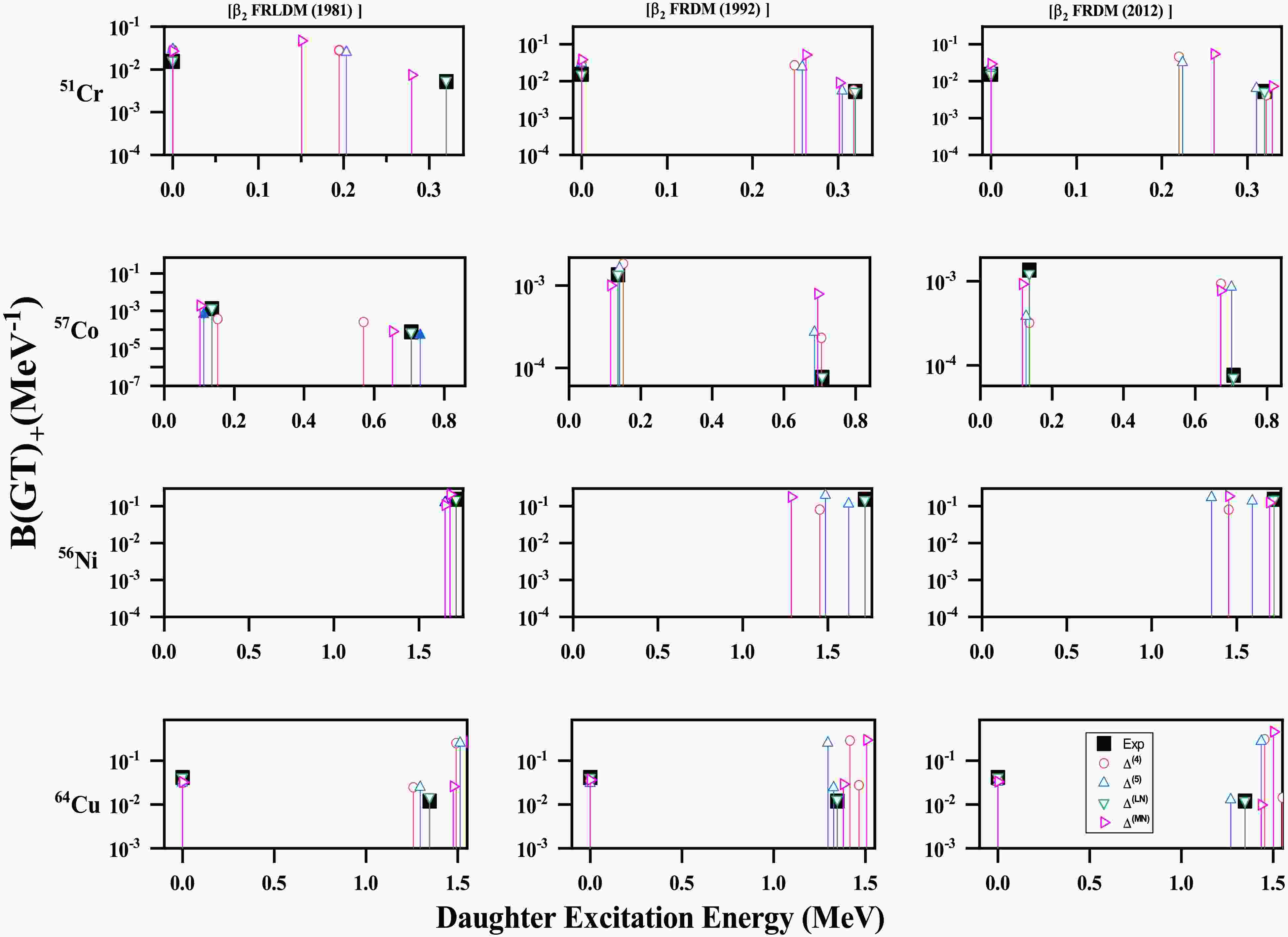 $ \Delta^{(4)} $ ,$ \Delta^{(5)} $ ,$ \Delta^{(\mathrm{LN})} $ and$ \Delta^{(\mathrm{MN})} $ and three nuclear deformation parameter sets derived from the$ \beta_{2} $ [FRLDM (1981)],$ \beta_{2} $ [FRDM (1992)] and the$ \beta_{2} $ [FRDM (2012)] in our investigation.Fig. 1 presents the calculated ground-state Gamow–Teller (GT) strength functions for