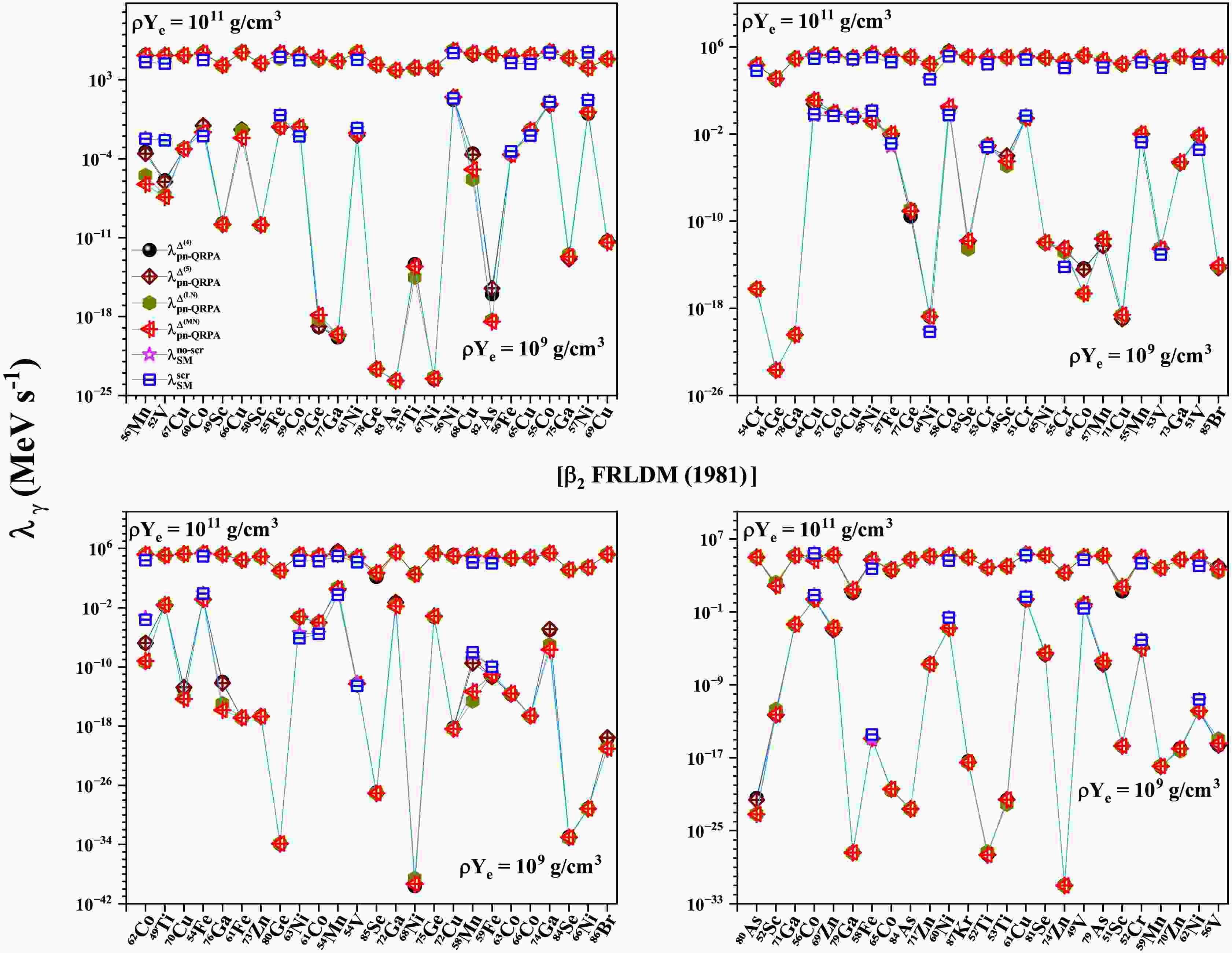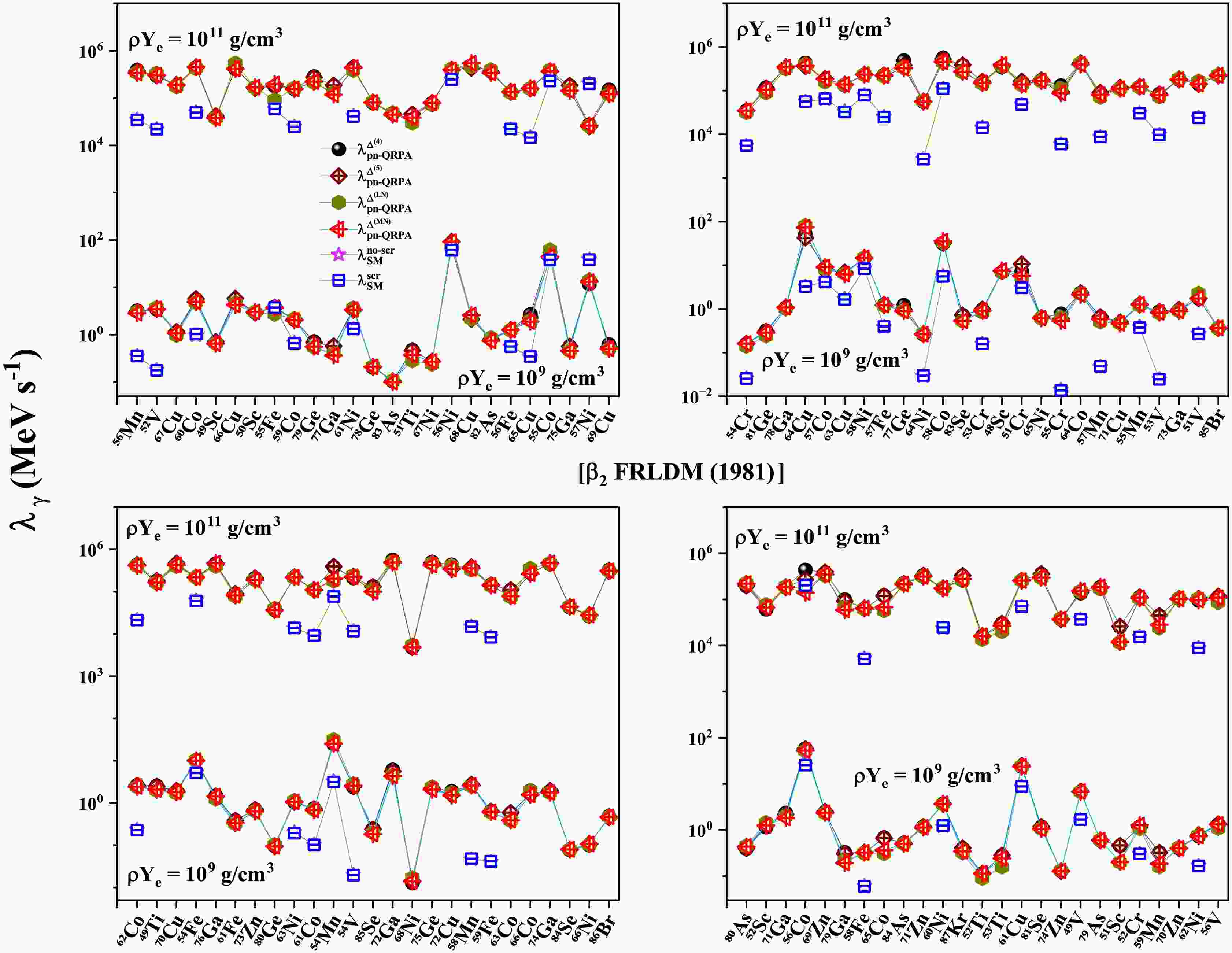 $ T (GK) $ $ \beta_{2} $ [FRLDM (1981)]$ \rho Y_{e} = 10^{9} $ $ g/cm^3 $ $ \rho Y_{e} = 10^{11} $ $ g/cm^3 $ $ \dfrac{\bar{\lambda}^{\Delta^{(4)}}_{pnQRPA}}{\bar{\lambda}^{scr}_{SM}} $ $ \dfrac{\bar{\lambda}^{\Delta^{(5)}}_{pnQRPA}}{\bar{\lambda}^{scr}_{SM}} $ $ \dfrac{\bar{\lambda}^{\Delta^{(LN)}}_{pnQRPA}}{\bar{\lambda}^{scr}_{SM}} $ $ \dfrac{\bar{\lambda}^{\Delta^{(MN)}}_{pnQRPA}}{\bar{\lambda}^{scr}_{SM}} $ $ \dfrac{\bar{\lambda}^{\Delta^{(4)}}_{pnQRPA}}{\bar{\lambda}^{scr}_{SM}} $ $ \dfrac{\bar{\lambda}^{\Delta^{(5)}}_{pnQRPA}}{\bar{\lambda}^{scr}_{SM}} $ $ \dfrac{\bar{\lambda}^{\Delta^{(LN)}}_{pnQRPA}}{\bar{\lambda}^{scr}_{SM}} $ $ \dfrac{\bar{\lambda}^{\Delta^{(MN)}}_{pnQRPA}}{\bar{\lambda}^{scr}_{SM}} $ 1 20.8 20.2 22.1 25.1 4.51 4.44 4.27 4.37 3 6.94 7.17 7.90 7.83 4.69 4.67 4.52 4.65 10 11.6 11.4 11.9 11.3 8.76 8.71 8.41 8.42 $ \beta_{2} $ [FRDM (1992)]1 23.2 22.4 24.1 25.0 4.68 4.69 4.45 4.56 3 6.88 6.92 7.53 7.39 5.37 5.36 5.11 5.24 10 13.8 13.7 12.7 12.9 10.1 10.1 9.33 9.61 $ \beta_{2} $ [FRDM (2012)]1 21.1 20.6 22.5 24.0 4.52 4.47 4.30 4.36 3 7.69 7.73 8.41 8.07 4.88 4.86 4.70 4.78 10 12.4 12.7 12.3 12.1 9.13 9.27 8.64 8.83 Table 2. Comparison of the reported pn-QRPA calculated mean γ -heating rates with shell model rates including screening effects [63].
