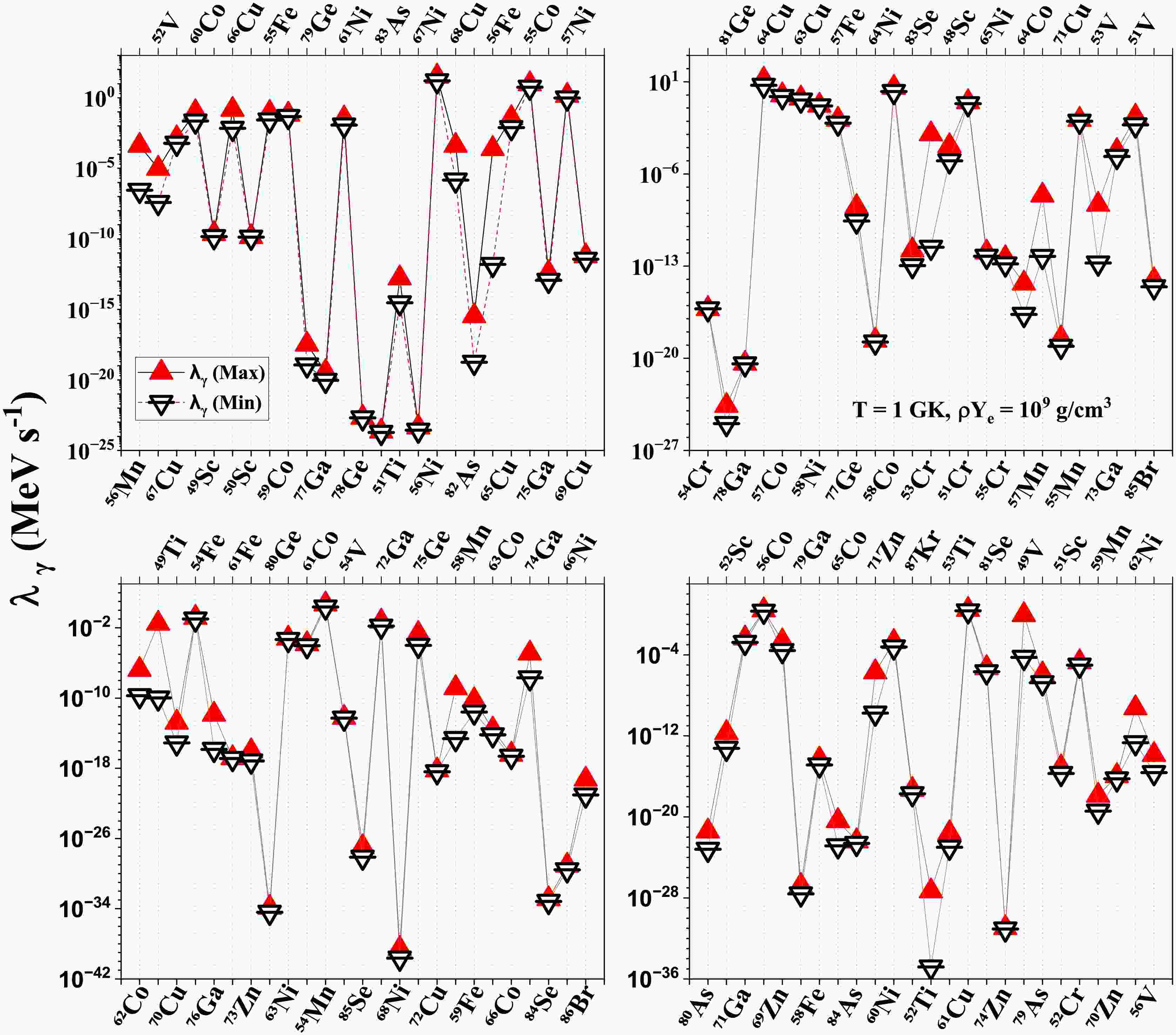 $ T = 1 $ GK,$ \rho = 10^{7} $ g/cm$ ^{3} $ ), the γ-heating rates are negligibly small [$ \sim $ ($ 10^{-40} $ -$ 10^{-10} $ ) MeV s$ ^{-1} $ ]. Under these physical conditions, excited states are not appreciably populated, and electron capture proceeds primarily from the parent ground state, often resulting in low-energy transitions or stable daughter nuclei, yielding little γ-ray heating.On the other extreme, for selected high-temperature and high-density regions (