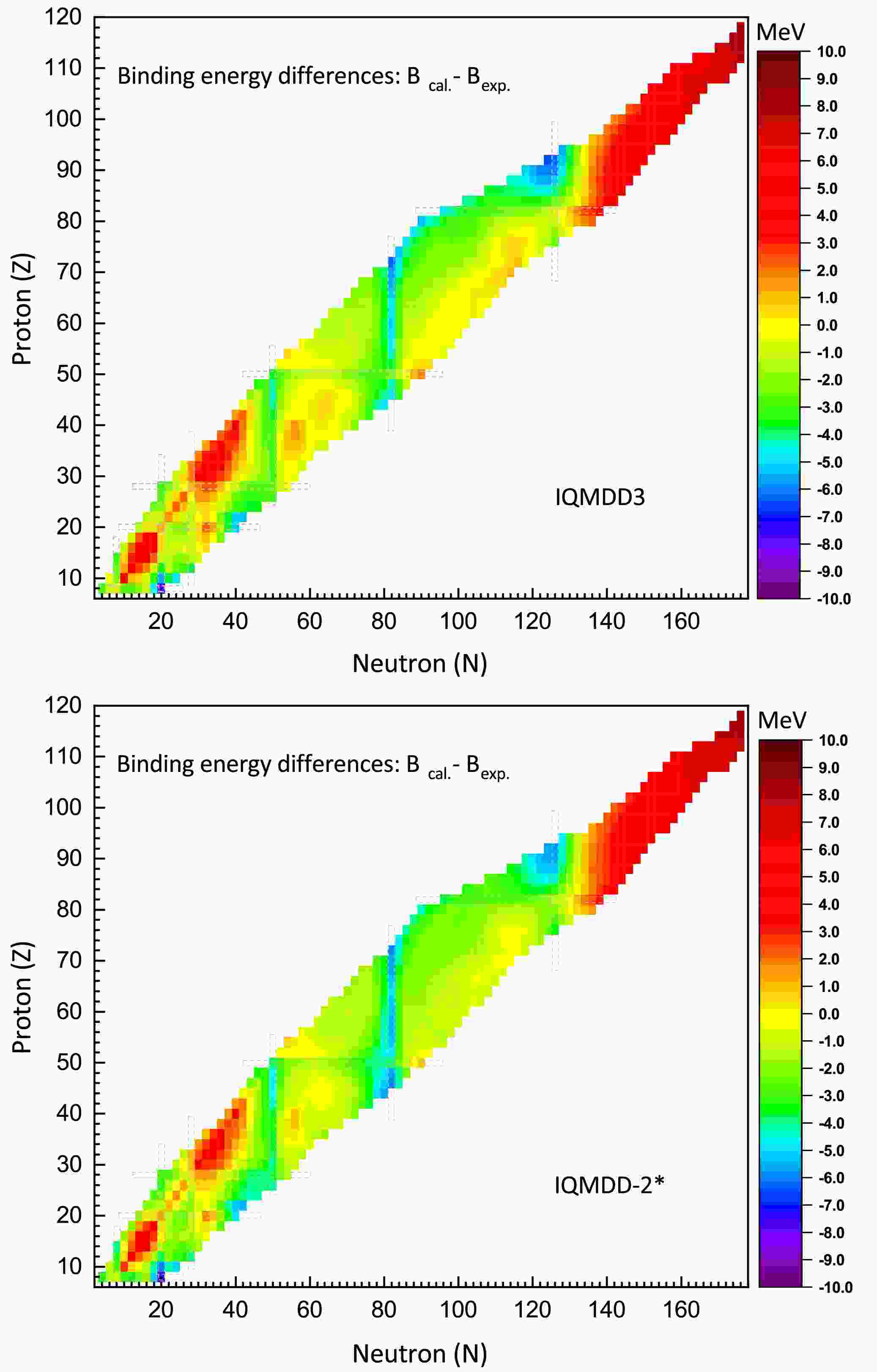 For comparison, the typical binding energy rms deviations of established EDFs are 1.518 MeV for PC-PK1 by including the rotational correction energies [118], 1.74 MeV for QMCπ-Ⅲ-T [119], 2.96 MeV for NL3* [120], 2.39 MeV for DD-ME2 [120], 2.29 MeV for DD-MEδ [120], 2.01 MeV for DD-PC1 [120], and 1.339 MeV for 91 spherical nuclei for PC-L3R [121]. In terms of predicting nuclear binding energies, the performance of IQMDD3 is overall comparable to that of NL3*.