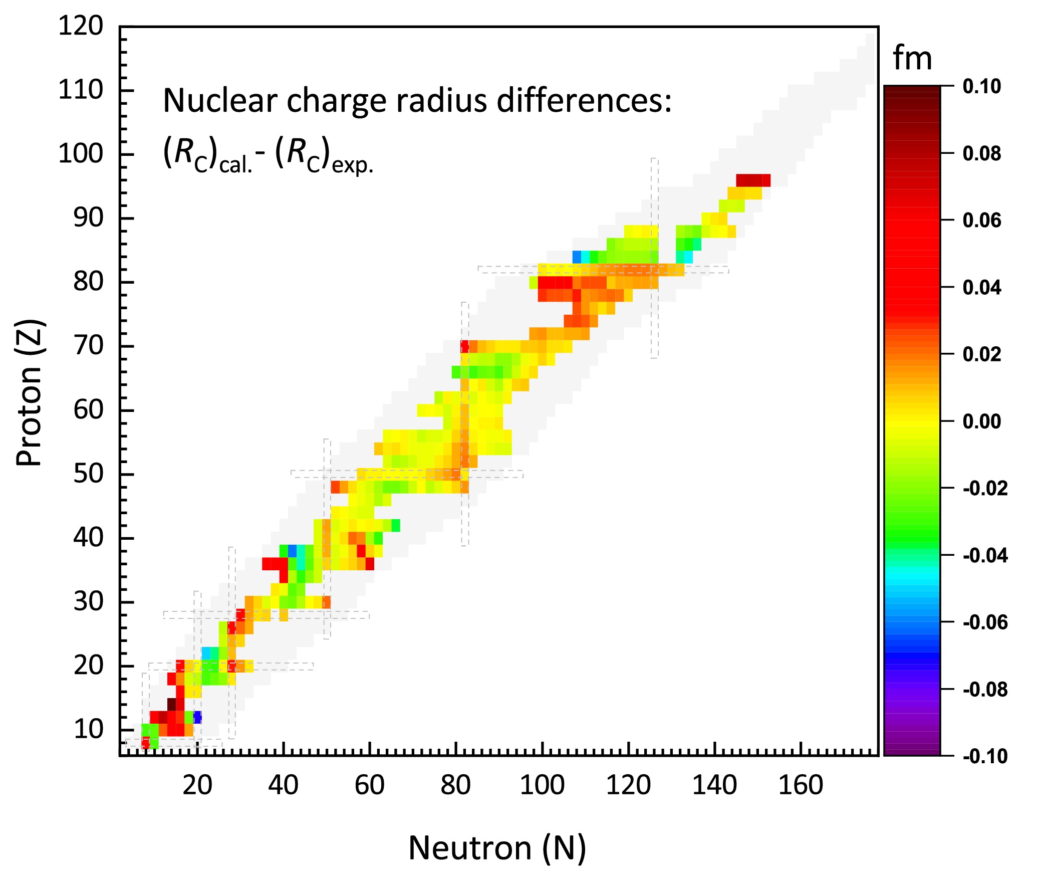 Figure 3.  (color online) Discrepancies between IQMDD3+RHB calculations and experimental data for even-even nuclei with measured charge radii.