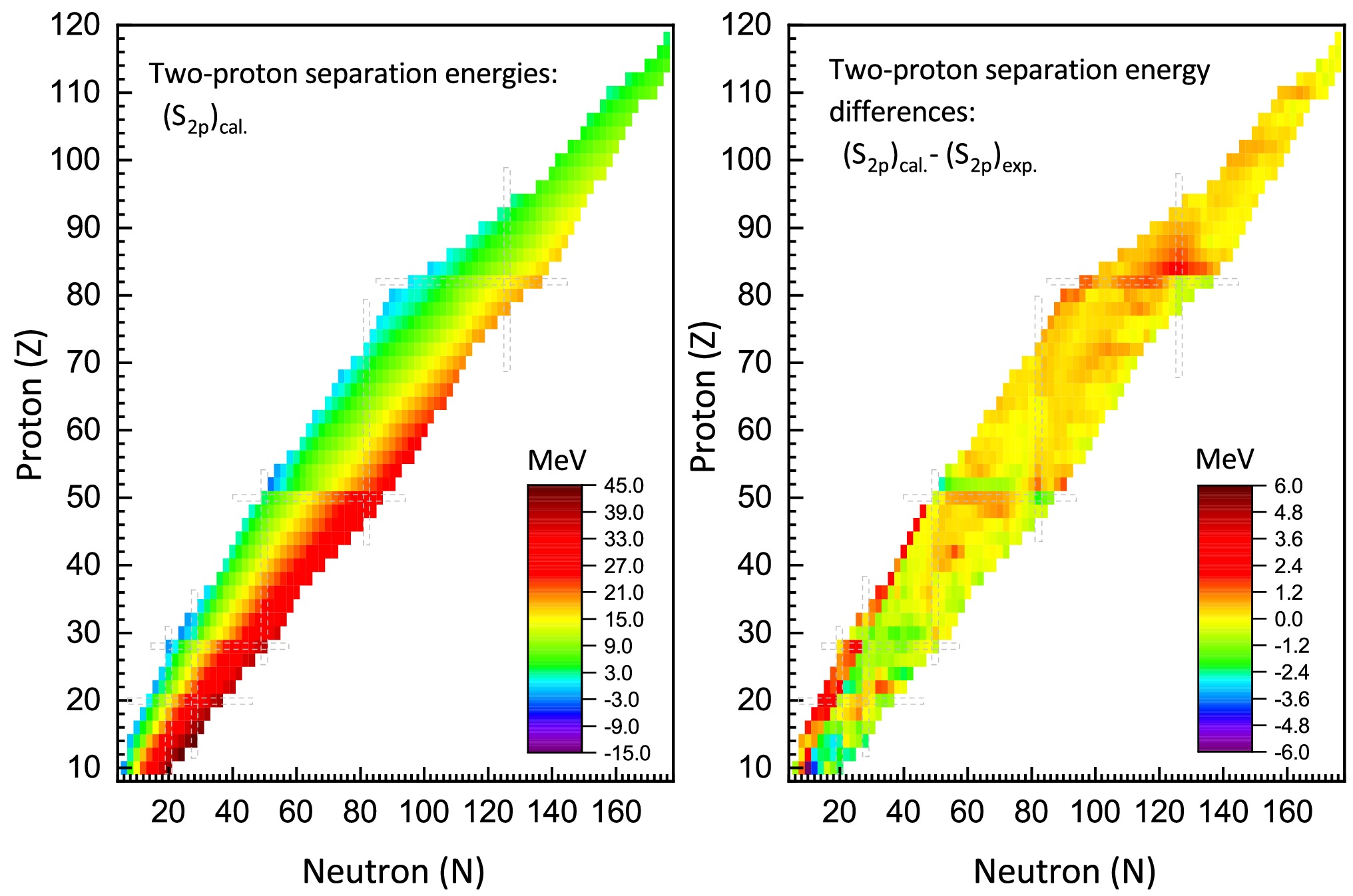 • Two-nucleon separation energies ($ S_{2n} $ and $ S_{2p} $) offer essential insights into the investigation of neutron and proton drip lines, nuclear shell evolution, and nucleon radioactivity phenomena [123]. They can be expressed as: