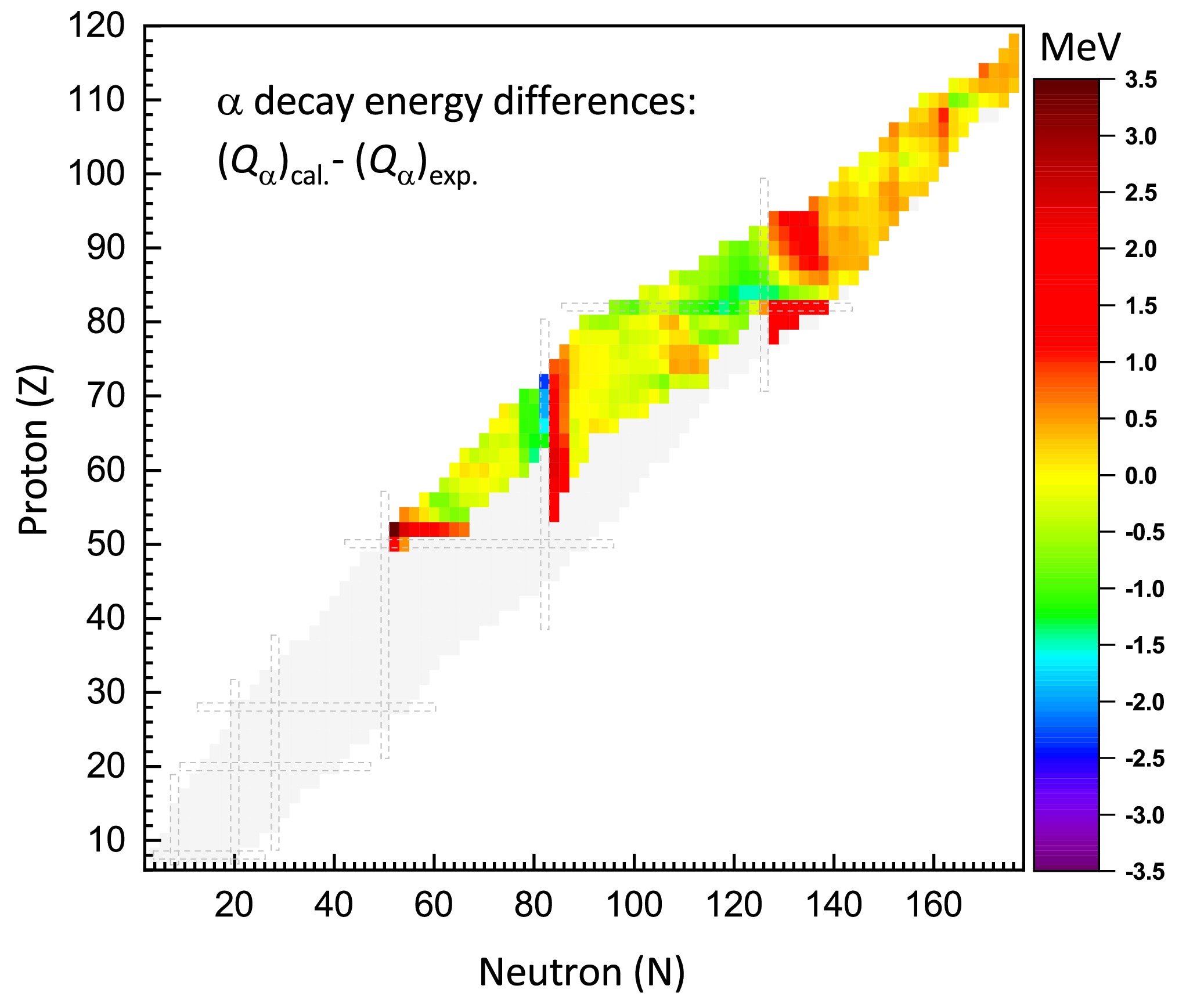 Fig. 8 presents the discrepancies between the $ Q_{\alpha} $ values calculated using the IQMDD3 model and the experimental data from Ref. [110]. Among the 405 studied even-even nuclei with positive $ Q_{\alpha} $ values, relatively larger deviations are observed in specific nuclei of the Z=52 and Z=94 isotopic chains, as well as in some nuclei along the N=84 isotonic chain. Overall, most of the discrepancies are within $ \pm1.5 $ MeV, and the rms of the discrepancies is 0.733 MeV. Recently, machine learning approaches have been successfully employed in the description of α-decay energies, achieving a remarkably high level of precision [124, 125].