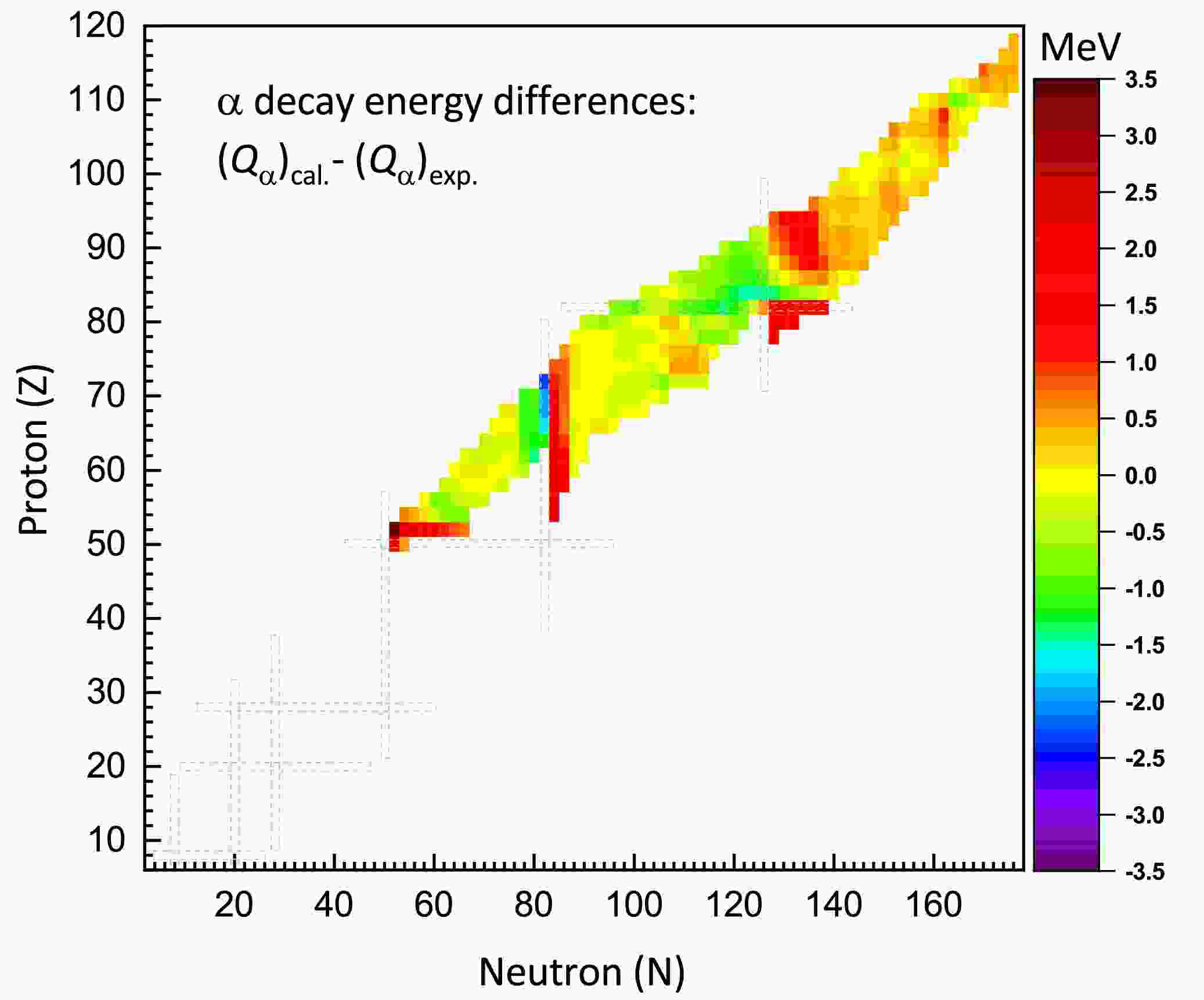Figure 8.  (color online) The discrepancies between the IQMDD3-calculated and experimental values of α decay energy $ Q_{\alpha} $.