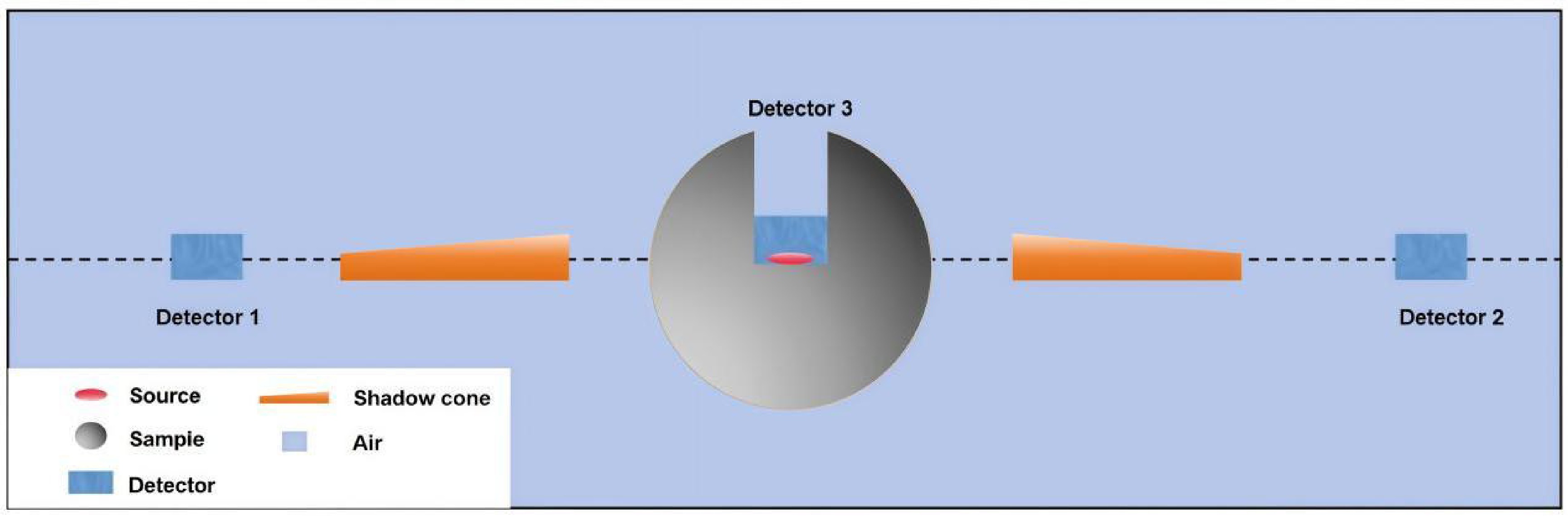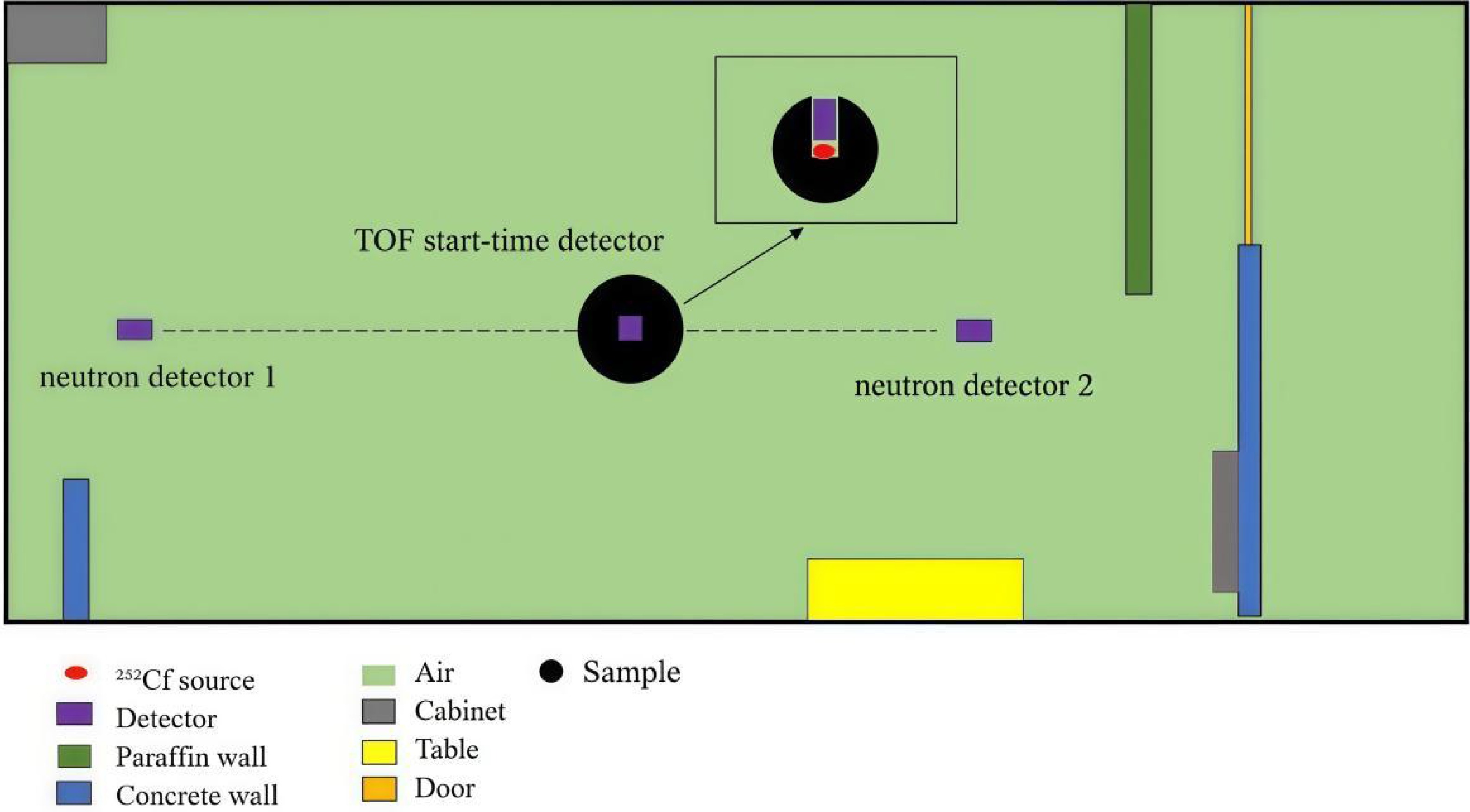 Based on the laboratory layout shown in Fig.2 (sample-in configuration), a comprehensive geometry model was developed to include all relevant structures and components. The detector efficiency was input using the simulation-based calibration curves verified by experimental data, . Given that the 252Cf neutron source used in the experiment was thin, it was modeled as a surface source. The dimensions and material composition of the neutron source backing were also accurately defined.