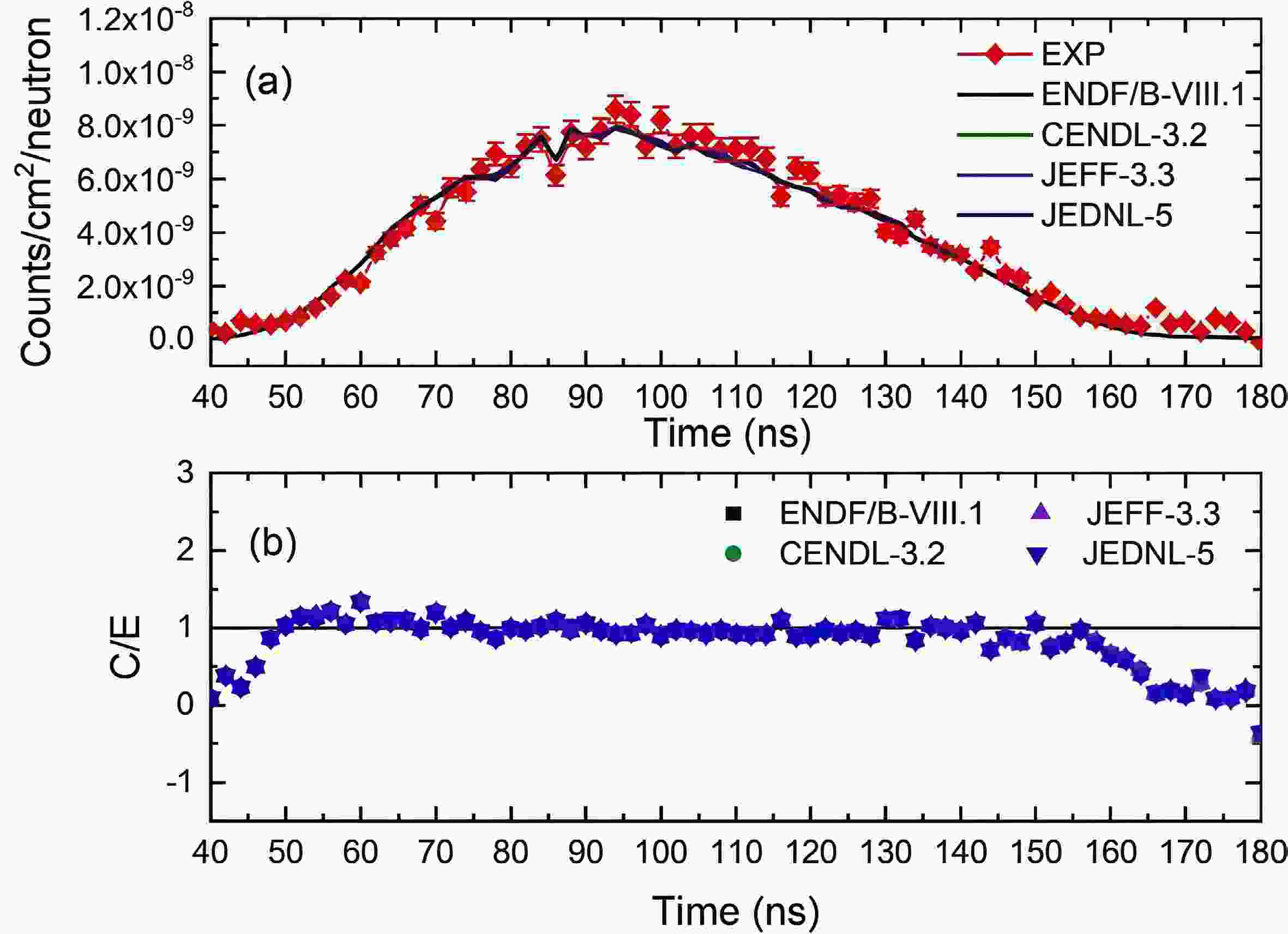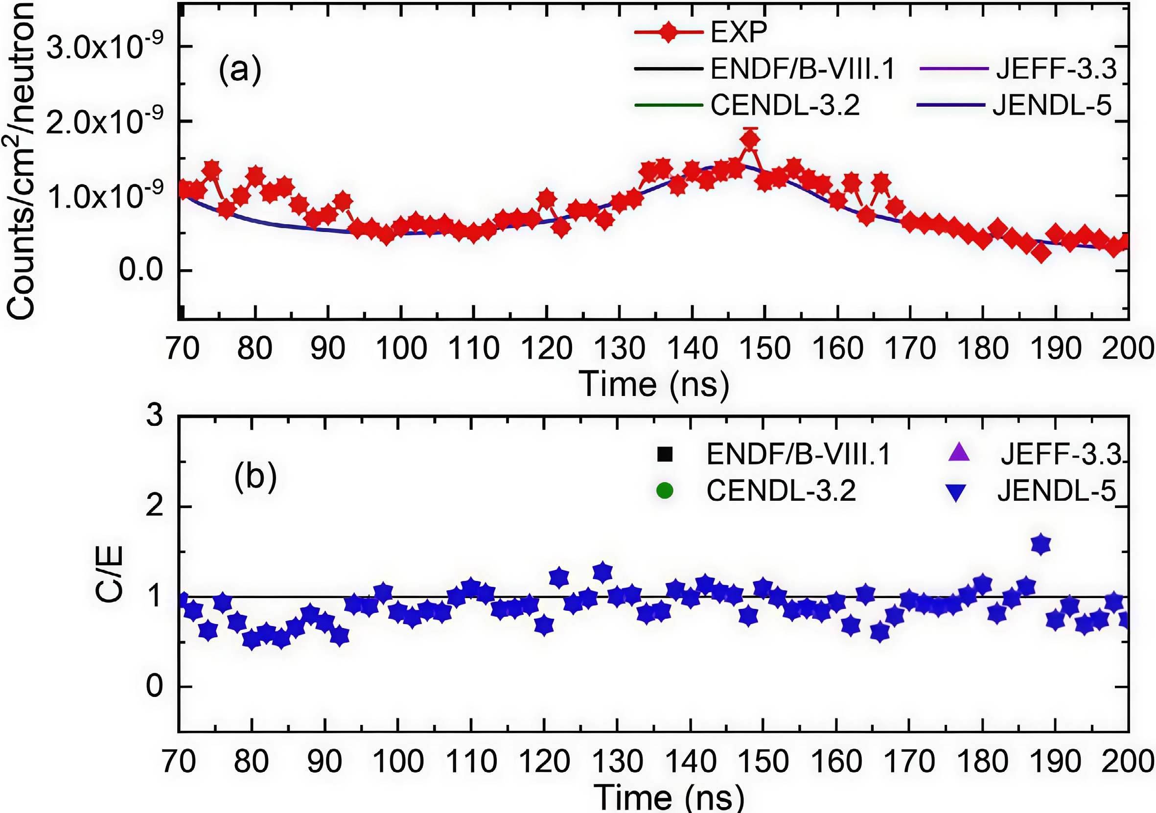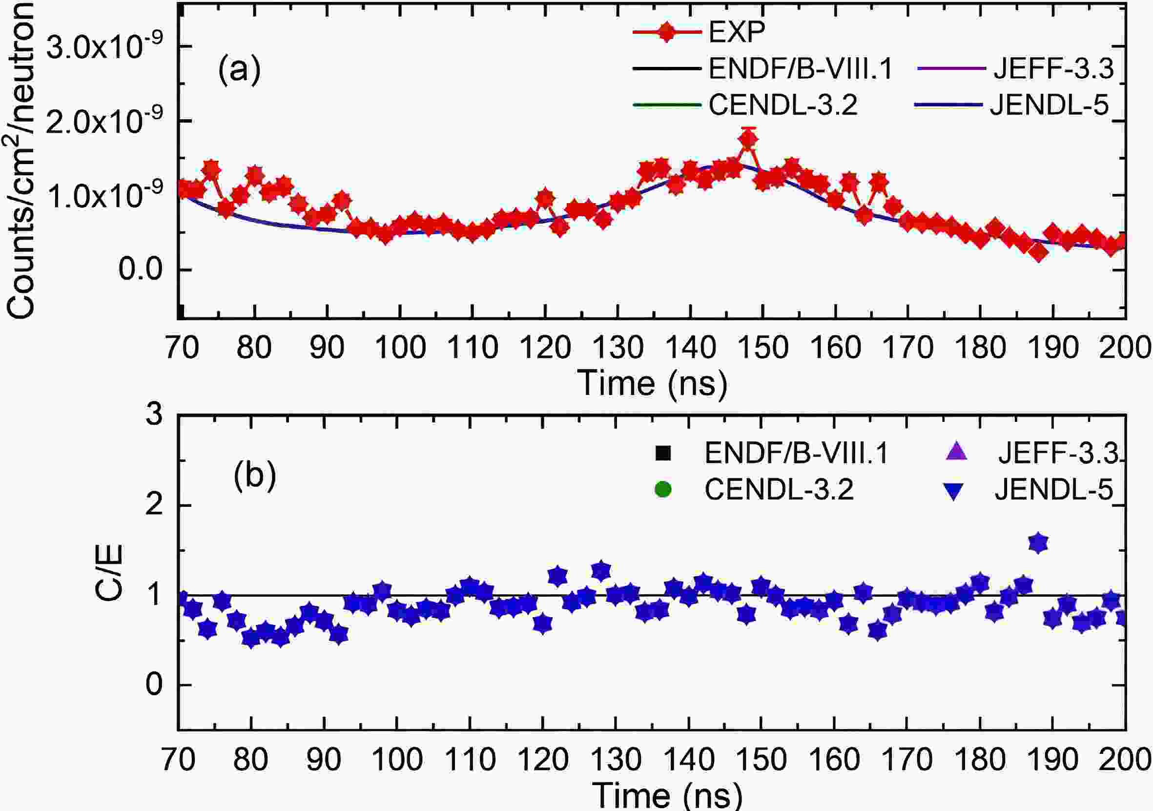 (1) In the energy range of 0.80–8.00 MeV (t=50–162ns), the simulated spectra based on data from the ENDF/B-VIII.1, CENDL-3.2, JEFF-3.3, and JENDL-5 libraries agree well with the experimental results. As shown in Fig.15(b), the C/E values exhibit minor fluctuations overall, with a slight deviation near 0.80 MeV (155–160ns), where the maximum discrepancy reaches 50%, which is attributed to the energy being close to the detection threshold.