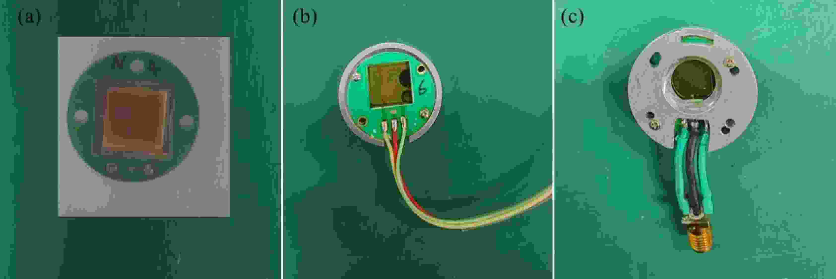 Figure 3. (color online) Photographs of the silicon carbide (SiC) detector:(a) Newly fabricated SiC detector; (b) Signal cable being soldered to the detector; (c) Detector placed inside a custom-made aluminum housing, with the circular area at the top designated for the neutron source.