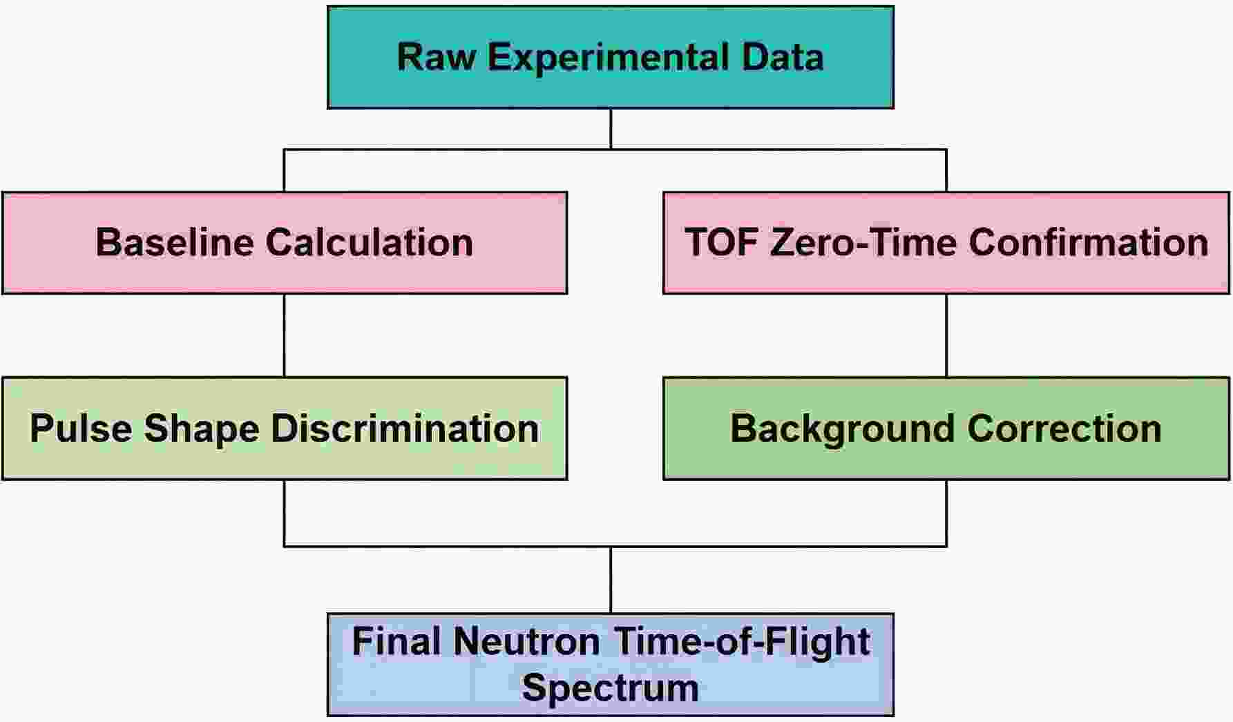 During the experiment, digitized waveform data from all detector channels were recorded, including signal pulse shapes, timestamps, and amplitude information. To obtain an accurate and reliable neutron TOF spectrum, the raw experimental data must be systematically processed, as illustrated in Fig.6. The processing procedure includes baseline calculation, TOF zero-time confirmation, background correction, and pulse shape discrimination. These steps enable the construction of a high-quality neutron TOF spectrum, which serves as a solid foundation for subsequent energy spectrum analysis and uncertainty evaluation.