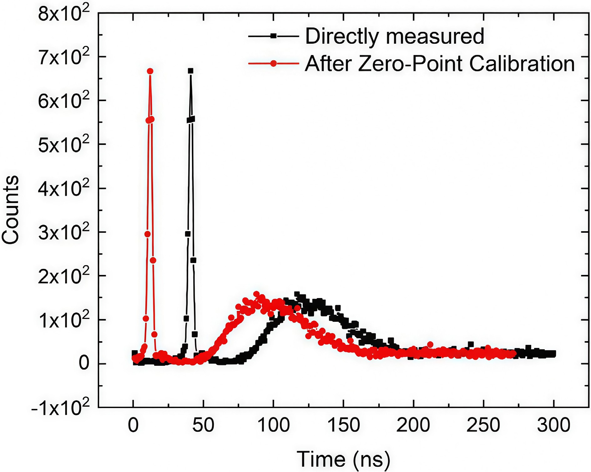 Using this method, an initial TOF spectrum is obtained, as shown by the black data points in Fig.8. It can be observed that there is a distinct gamma peak at the far left of the spectrum, originating from gamma rays emitted either during the fission process of the 252Cf neutron source or from neutron scattering. This gamma peak marks the beginning of the recorded flight times. If the TOF zero-time is not corrected, a discrepancy arises between the measured flight times and those calculated using the TOF equation.