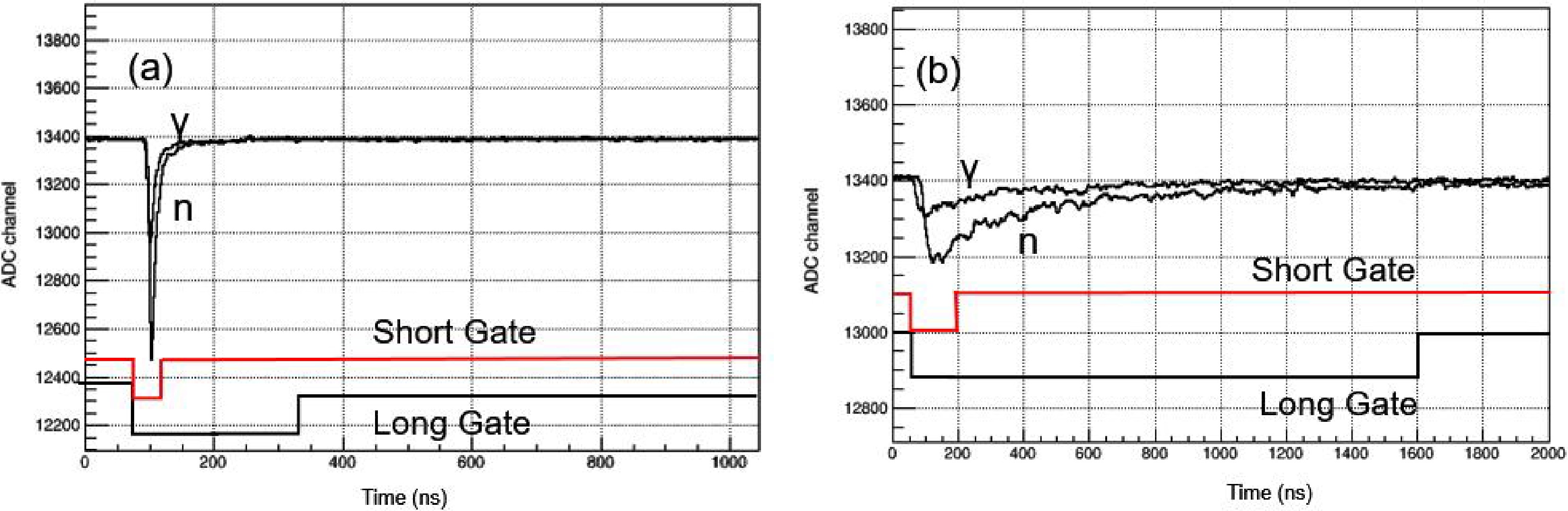 Figure 9. (color online) Measured pulse waveforms and the settings of long and short integration gates (a) EJ-309 detector; (b) CLYC detector.