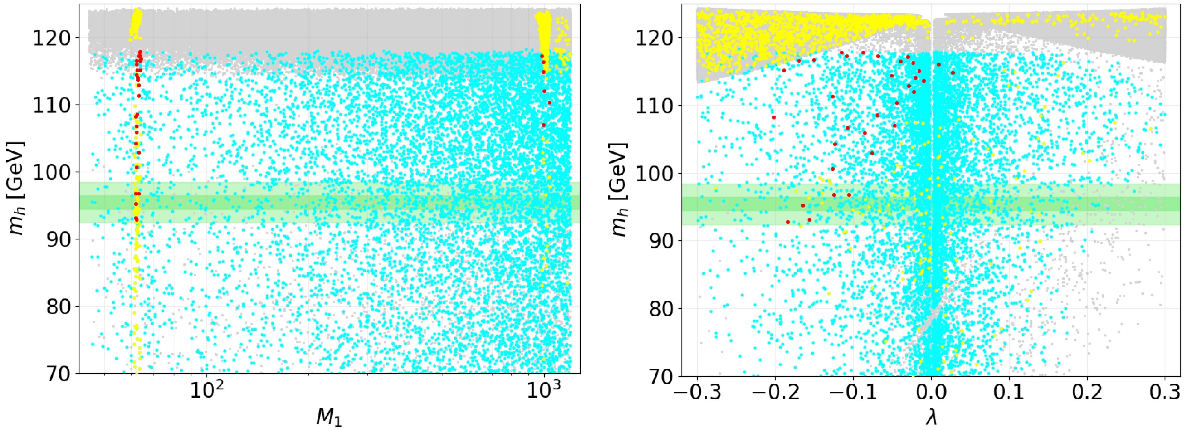 $ m_h $ and$ M_1 $ , while the right panel presents the correlation between$ m_h $ and λ. The color scheme follows the description in the color conditions and the surrounding context. The green band indicates that$ m_h=95.4\pm 1\; \mathrm {GeV} $ , the light green area represents$ m_h=95.4\pm 3\; \mathrm {GeV} $ .In the right panel of Fig.6, the quartic coupling λ exhibits a