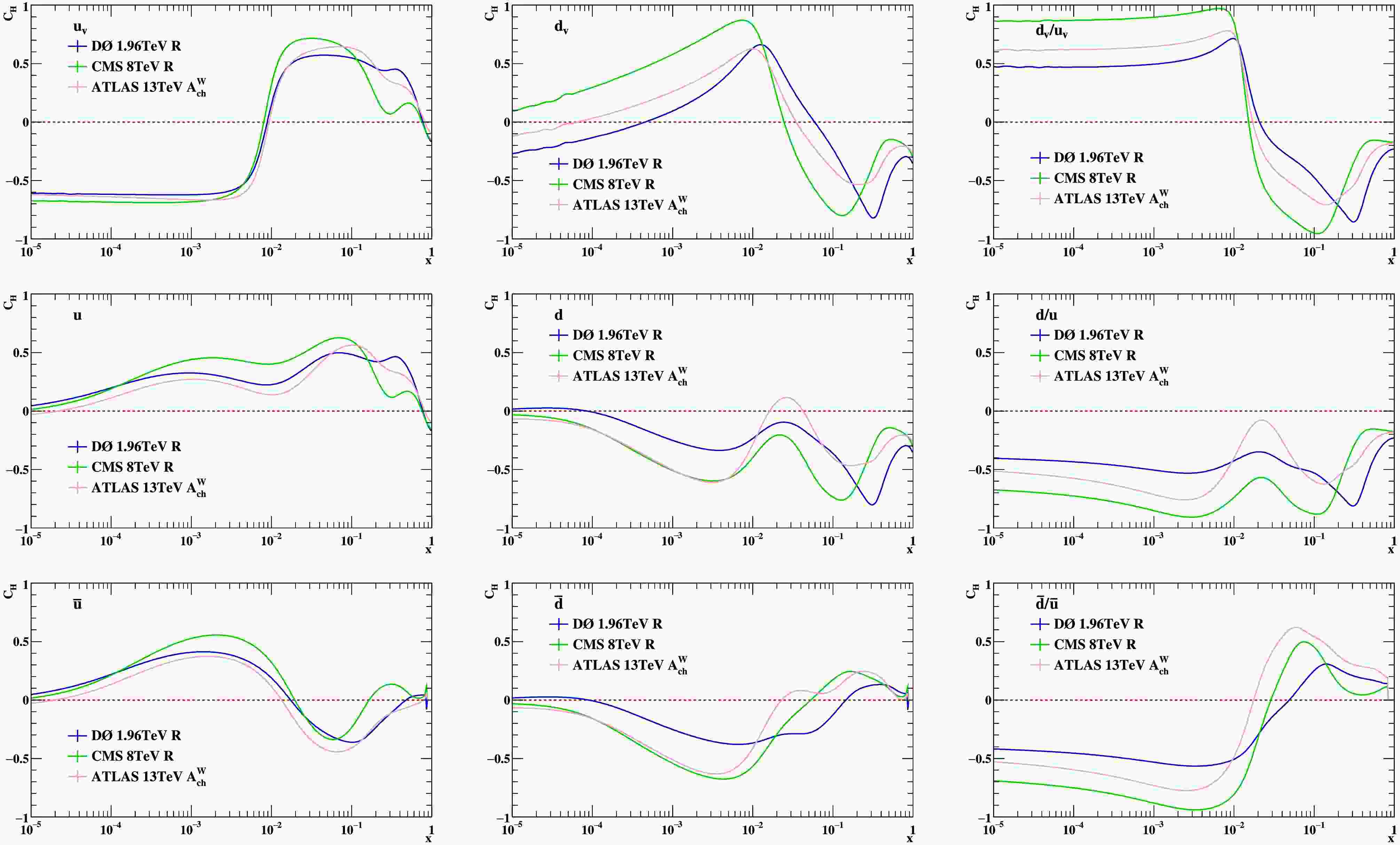 $ C_H(E,f) $ between the new datasets and the$ u_v $ ,$ d_v $ ,$ d_v/u_v $ , u, d,$ d/u $ ,$ \bar{u} $ ,$ \bar{d} $ and$ \bar{d}/\bar{u} $ PDFs are shown in Figure 2. The used quark PDFs are from CT18NNLO. The D0 1.96 TeV R measurement (the blue curve), the CMS 8 TeV R measurement (the green curve) and the ATLAS 13 TeV$ A^W_{\rm{ch}} $ measurement (the pink curve) are plotted together. It should be emphasized that the exact definition of R, as given in Reference [5], is employed in this chapter and in Chapter IV, rather than the approximate expressions presented in Equations 1 and 2.