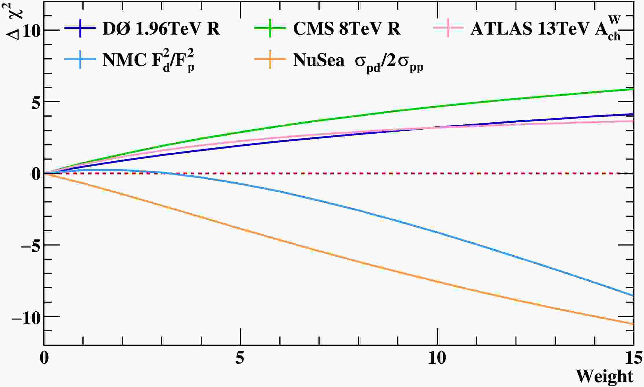 Figure 3. (color online) Impact on the global fit by increasing the weight (from 0 to 15) of the three new input datasets (