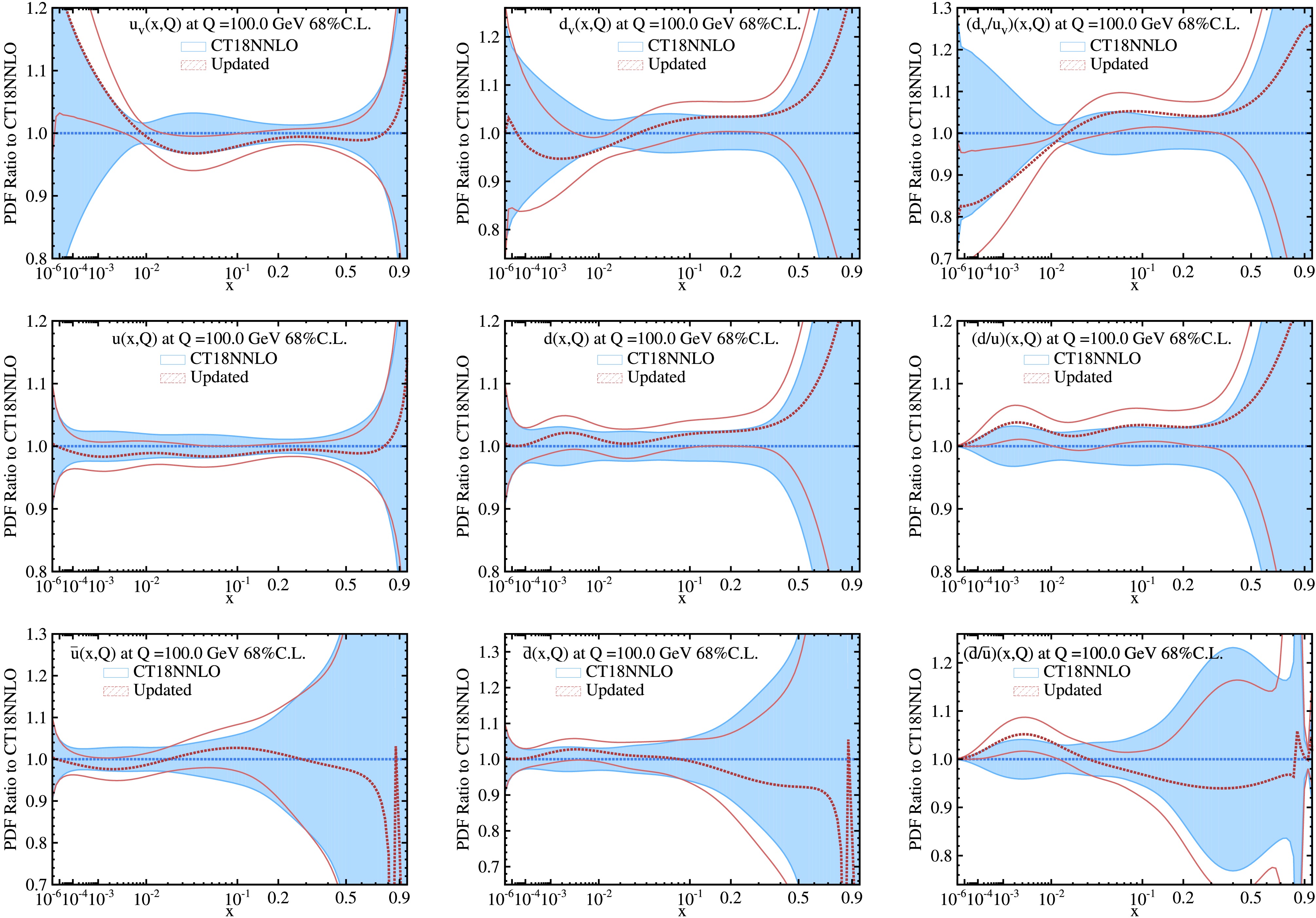 Figure 4. (color online) Comparison between updated PDFs, which are updated by the three new datasets with weight 15, and the original CT18NNLO central predictions. Each plot shows the ratio of the updated PDF to the original one, with associated uncertainty bands.