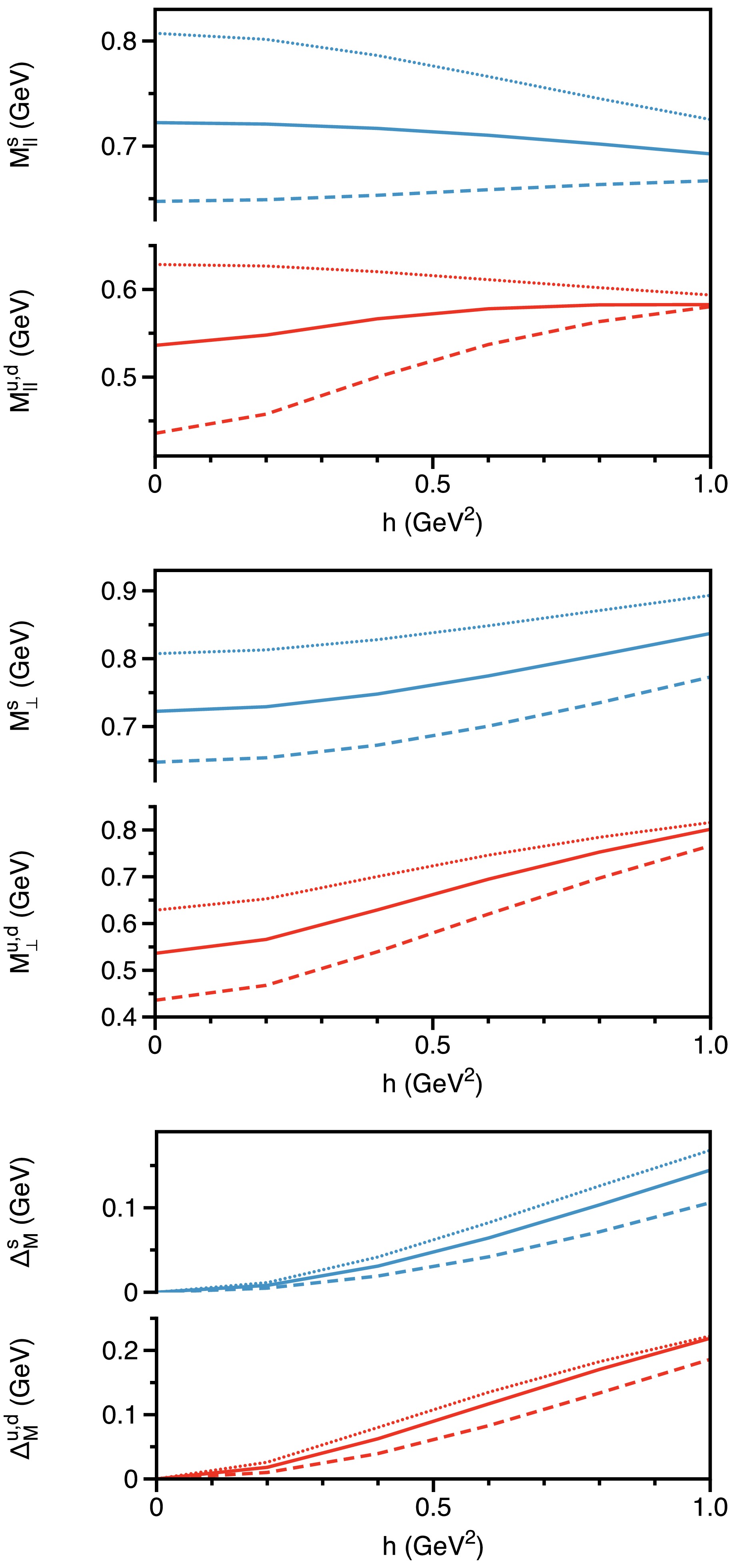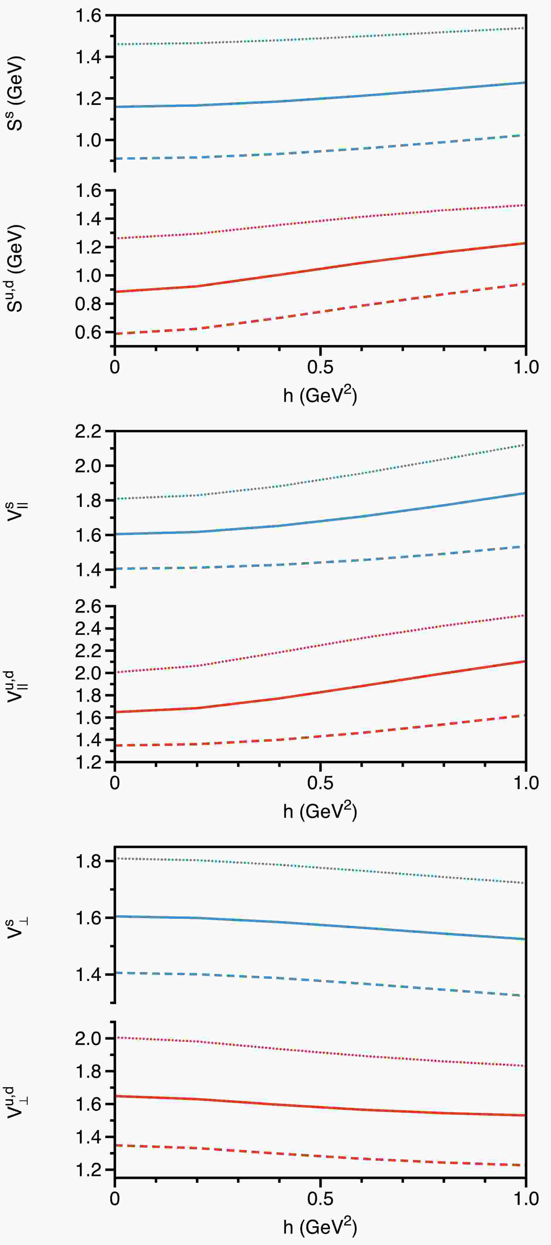 $ {\cal{S}} $ ,$ {\cal{V}}_\parallel $ ,$ {\cal{V}}_\perp $ ,$ {\cal{A}}_v $ , and$ {\cal{T}} $ are re-combinations of the dressing functions$ {\cal{A}} $ to$ {\cal{E}} $ :$ \begin{aligned}[b] {\cal{S}}&=\frac{{\cal{B}}+{\cal{D}}}{2}\,,&{\cal{V}}_\parallel&=\frac{{\cal{A}}+{\cal{C}}}{2}\,,& {\cal{V}}_\perp={\cal{E}}\,, \\ |q_fB|{\cal{A}}_v&=\frac{{\cal{A}}-{\cal{C}}}{2}\,,&2|q_fB|{\cal{T}}&=\frac{{\cal{B}}-{\cal{D}}}{2}\,. \end{aligned} $