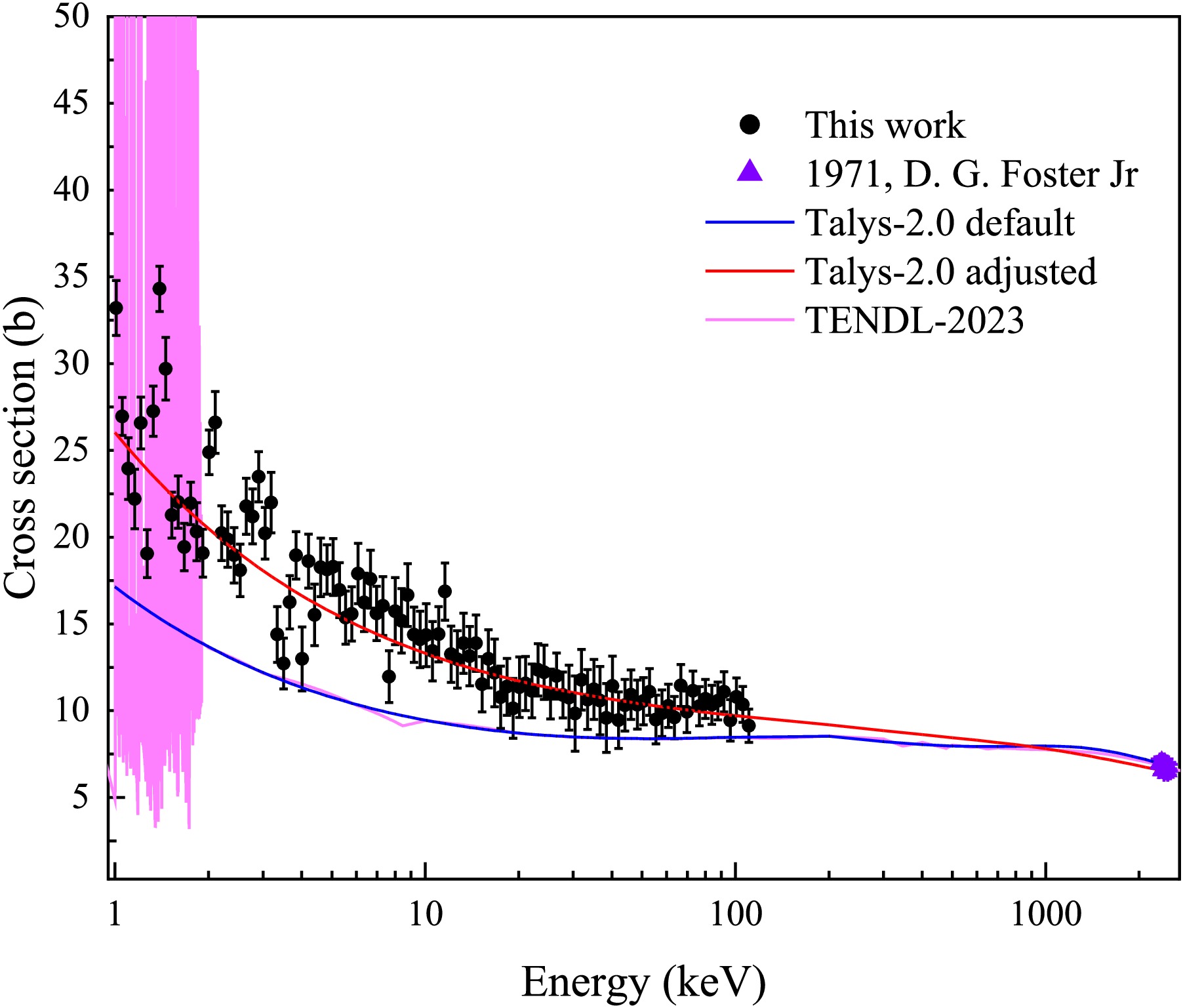 Figure 13. (color online) Experimental data in the 1–110 keV range (black) compared with TALYS-2.0 calculations using default (blue) and adjusted (red) parameters, and with evaluated data from TENDL-2023 (pink). When extended to 2.5 MeV, the adjusted parameters yield cross section consistent with the results of D. G. Foster Jr. [34] in the 2.3–2.5 MeV range, with deviations mostly below 5%.