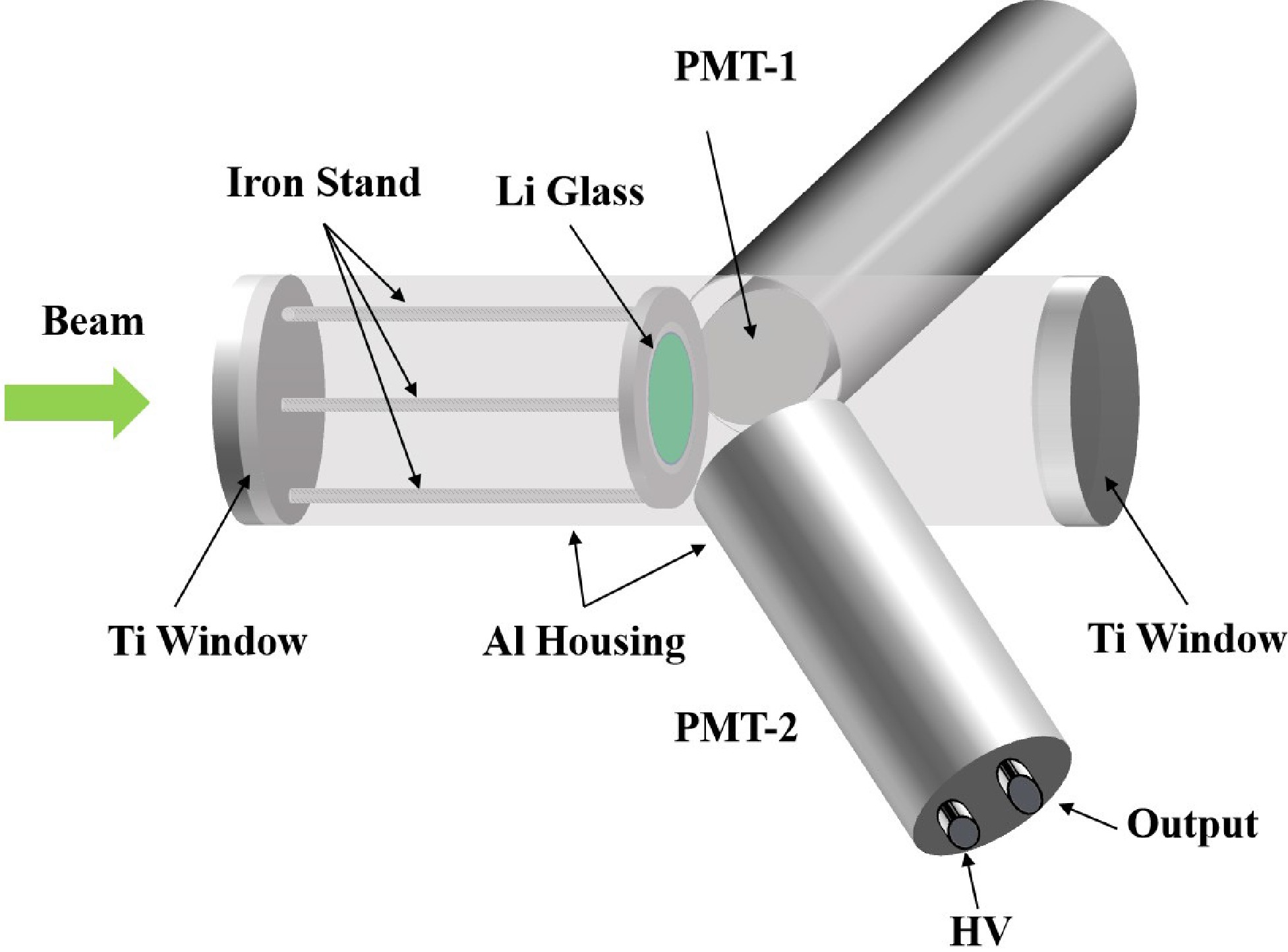Figure 3. (color online) Structure of the detector. It is consisted of three coupled aluminum tubes. The central tube is aligned with the beam, where a 6Li-glass scintillator (6Li-GS) and a 7Li-glass scintillator (7Li-GS) can be installed interchangeably. The PMTs are housed in the side tubes set at
