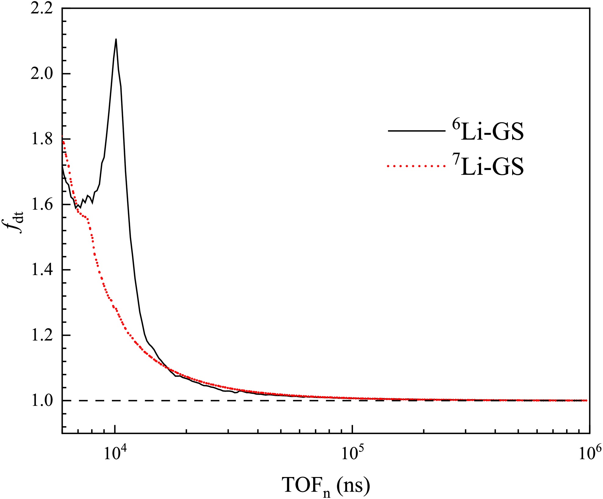 $ N_{i} $ is the counts normalized to the proton pulse and bin width. The variation of$ f_{dt} $ as a function of$ TOF $ is shown in Fig. 6. Above 16,700 ns (corresponding to neutron energy below 110 keV), the correction factors for both the 6Li-GS and 7Li-GS detectors decrease with increasing$ TOF $ . Within this range, counts losses remain below 10%, indicating that the data are reliable and suitable for further analysis. To correct for beam fluctuations and differences in measurement duration, each spectrum was normalized using the reciprocal of the corresponding proton count before background subtraction. -