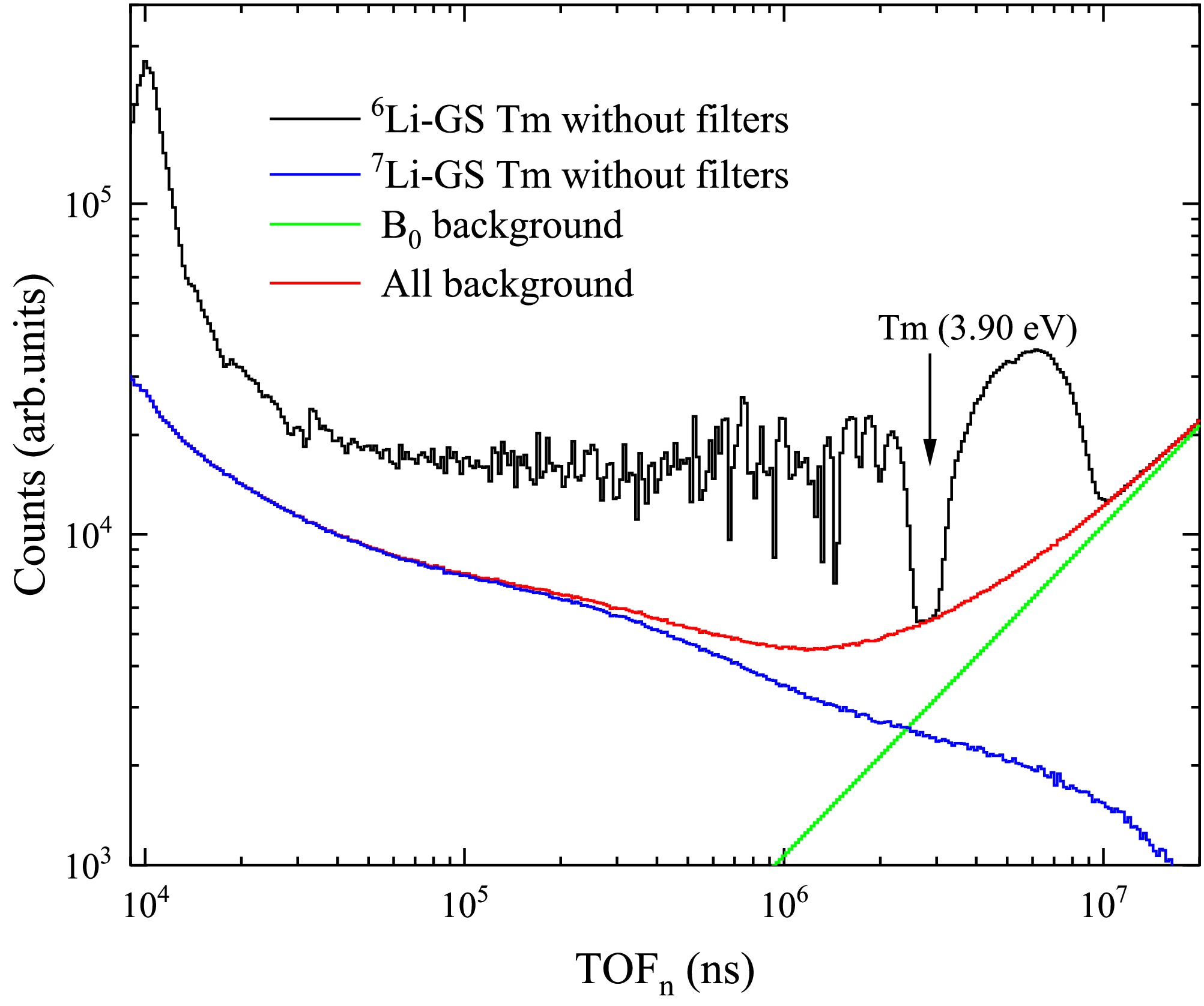 Figure 7. (color online) Background with the sample using the 6Li-GS and 7Li-GS detectors. The green curve represents the flat background, the blue curve represents the in-beam γ-ray background, and the red curve shows the total background contributing to the TOF spectrum measured by the 6Li-GS detector (black curve).