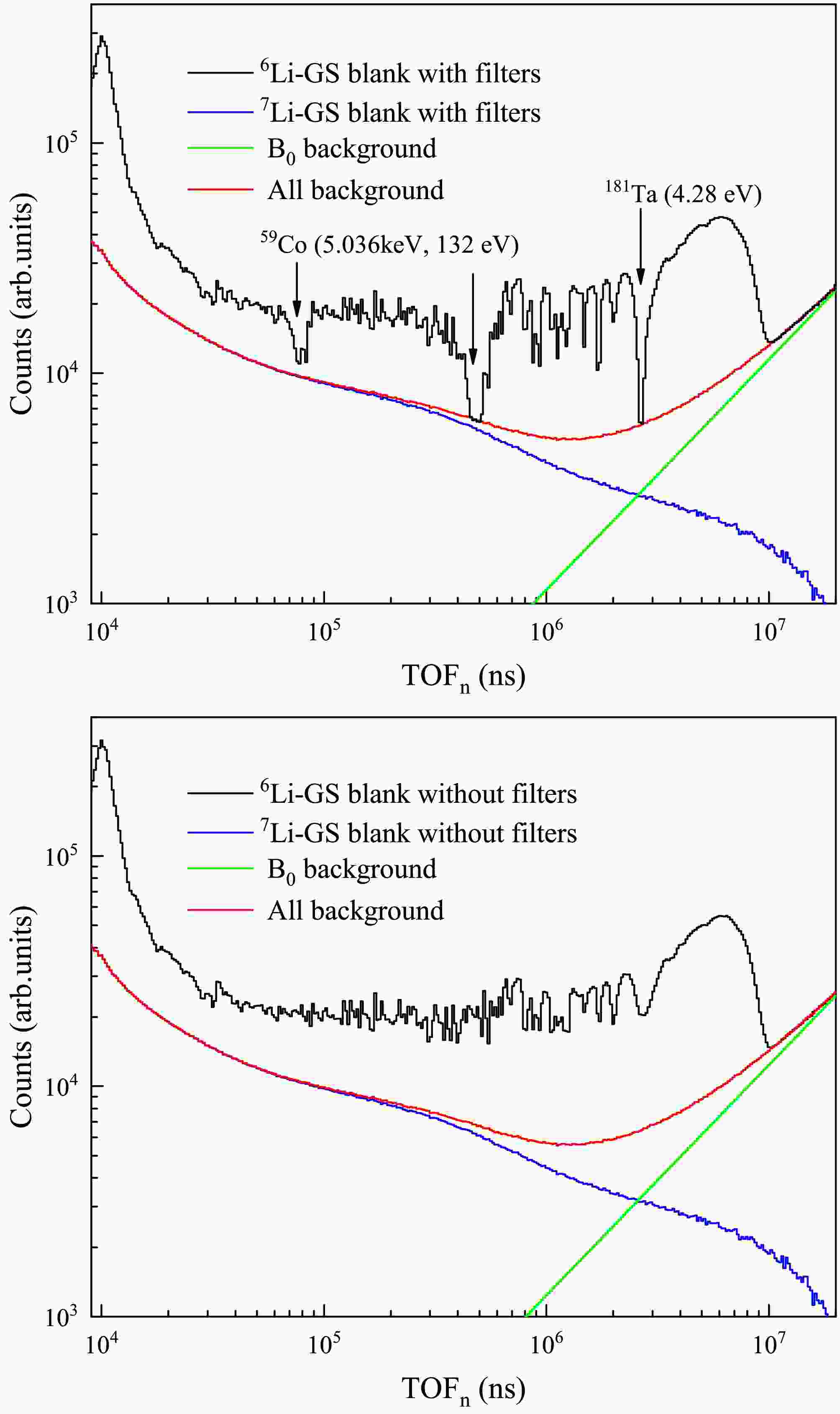 Under the sample-out conditions, the absence of the sample absorption peak makes it impossible to determine the in-beam γ-ray normalization factor directly, instead, it is obtained using the 7Li-GS detector combined with the black resonance filter technique. Filters with strong cross section at neutron resonance absorption peaks were employed to fully absorb neutrons at specific energies [25], thereby creating black resonance valleys in the spectra. As shown in Fig. 8, there are distinct valleys observed at the resonance peaks of 59Co (132 eV, 5.036 keV) and 181Ta (4.28 eV), where most incident neutrons are absorbed and the remaining part corresponds to background. The background of the 6Li-GS detector without filters can be determined by