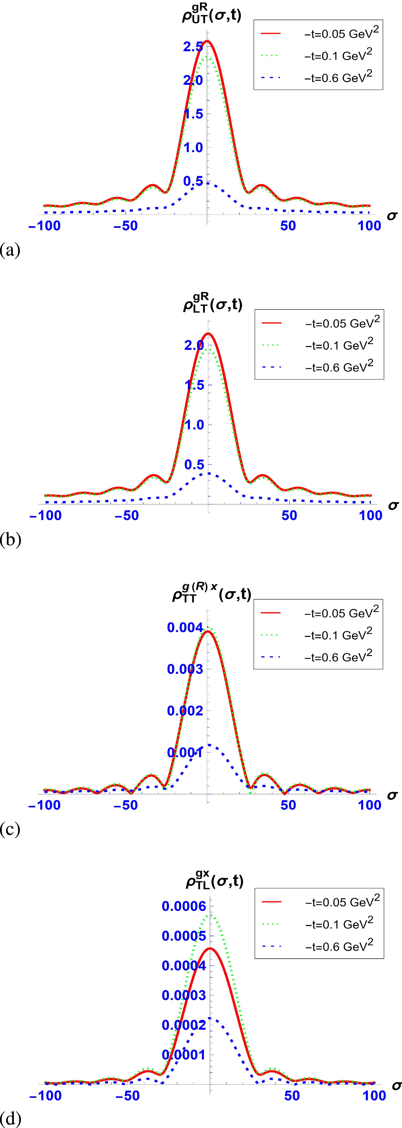 $ \rho^g_{UU} $ ,$ \rho^{gR}_{UT} $ ,$ \rho^{gR}_{LT} $ ,$ \rho^{g(R)x}_{TT} $ , and$ \rho^{gx}_{TL} $ are analyzed in σ space through the two-dimensional plots shown in Figs. 1 and 2. All distributions exhibit a diffraction-like oscillatory behavior and sensitivity to the momentum transfer$ -t $ , consistent with earlier findings for gluon Wigner distributions in unpolarized and longitudinally polarized configurations reported in [28]. Similar oscillatory diffraction patterns have also been observed in studies of quark Wigner distributions within the dressed quark model and the light-front quark-diquark model [12, 22]. While quark Wigner distributions with transverse polarization have been explored in various models, to the best of our knowledge, the present work provides the first analysis of gluon Wigner distributions with transverse polarization in the boost-invariant longitudinal impact parameter space.