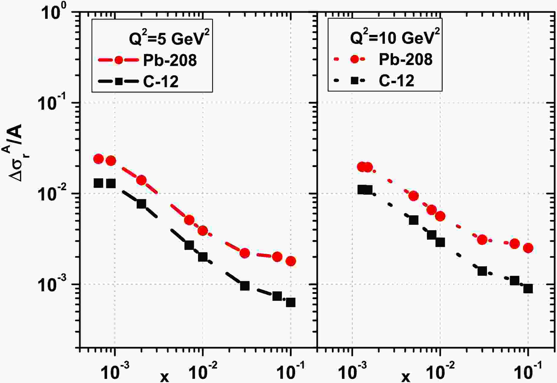$ \frac{{\partial}{\Delta}\sigma_{r}^{A}(x,Q^2)}{A{\partial}{\Delta}\sigma_{r}(x,Q^2)}|_{y=cte}{\simeq} \frac{\partial{\Delta}F_{2}^{A}(x,Q^2)}{A\partial{\Delta}F_{2}(x,Q^2)}= $ $ A(R_{g}^{A})^2\frac{{\pi}{\cal{R}}^{2}_{p}}{{\pi}{\cal{R}}_{A}^2} $ as a function of Bjorken-x for the light nucleus of C-12 (green curves) and the heavy nucleus Pb-208 (blue curves) with$ {\pi}{\cal{R}}^{2}_{p}=1.55{\pm}0.02\; {\rm{fm}}^2 $ and$ {\cal{R}}_{A}=1.12A^{1/3}- $ $ 0.86A^{-1/3}\; {\rm{fm}} $ .$ R_{g}^{A} $ is predicted by the HIJING parameterization.For comparison with the nCTEQ15 nPDFs [45] results, we calculate the expression