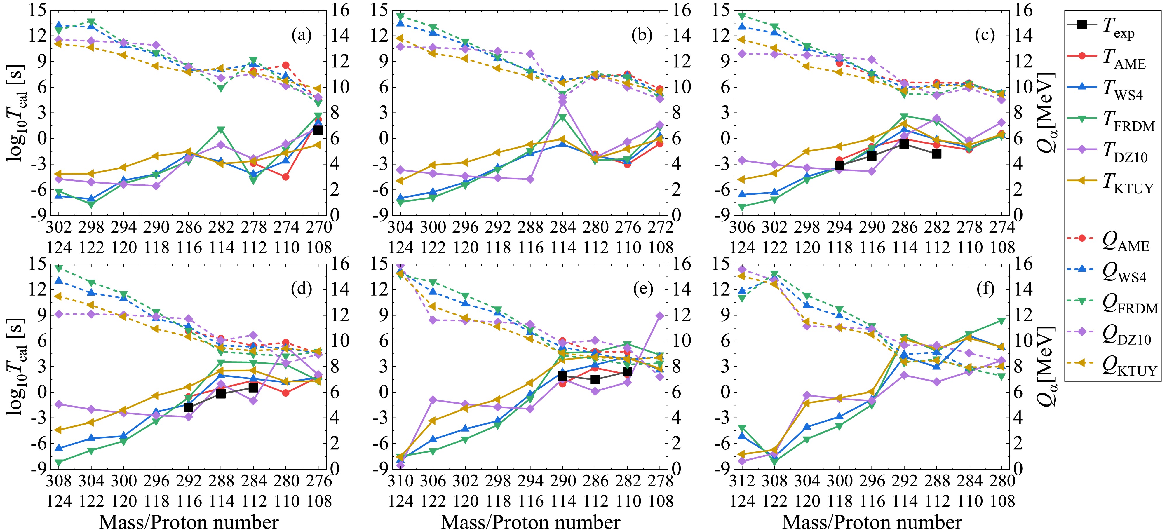 Besides the preformation factor $ P_{\alpha} $, the accuracy of the calculated α-decay half-lives $ T_{1/2} $ also depends critically on the α-decay energies $ Q_{\alpha} $ which can be determined by direct experimental data or available nuclear masses. Since the decay half-life depends exponentially on the decay energy, small uncertainty in nuclear masses can propagate into the predicted half-lives by orders of magnitude differences. Several global nuclear mass models, such as the Weizsäcker-Skyrme model (WS4) [4549], the finite-range droplet model (FRDM) [5052], the Duflo–Zuker model (DZ10) [5355], and the KouraTachibana-Uno-Yamada model (KTUY) [56], are widely used to reproduce the experimental masses given in the Atomic Mass evaluation (AME2020) [5759] throughout the nuclide chart and predict theoretical masses for possible nuclides. These models incorporate liquid-drop contributions, shell corrections, pairing, and diffuseness effects, and can reproduce known α-decay energies consistently. Recently, the microscopic density functional theory approaches, particularly the relativistic mean-field with PC-PK1 parametrization, have achieved great success in describing nuclear masses across the nuclear chart [6067]. All these models can reproduce the experimental data very well, however, their extrapolations into regions lacking experimental data can diverge significantly, especially in the superheavy region.