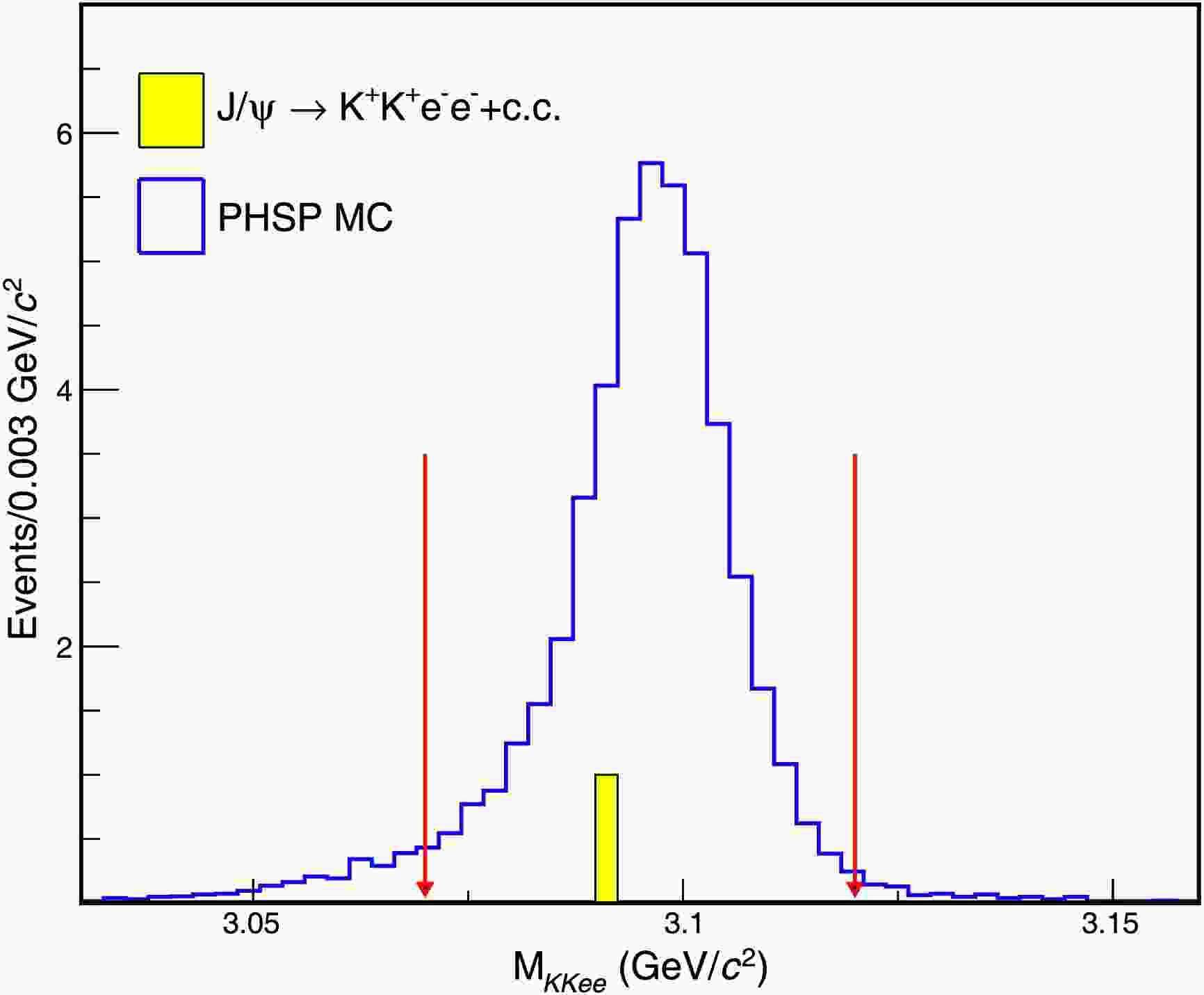 $ J/\psi $ signal region is defined as$ [3.07,\; 3.12] $ GeV/$ c^2 $ , which corresponds to a range of three times of the mass resolution around the$ J/\psi $ mass [35]. The detection efficiency is determined to be 15.68% based on the simulated$ J/\psi \to K^+K^+e^-e^- $ events.With all above selections applied, only one event from data is left in the signal region as shown in Fig. 2, while no event survives from the inclusive MC sample. To investigate the potential contamination from continuum processes, we analyze the off-resonance data samples taken at