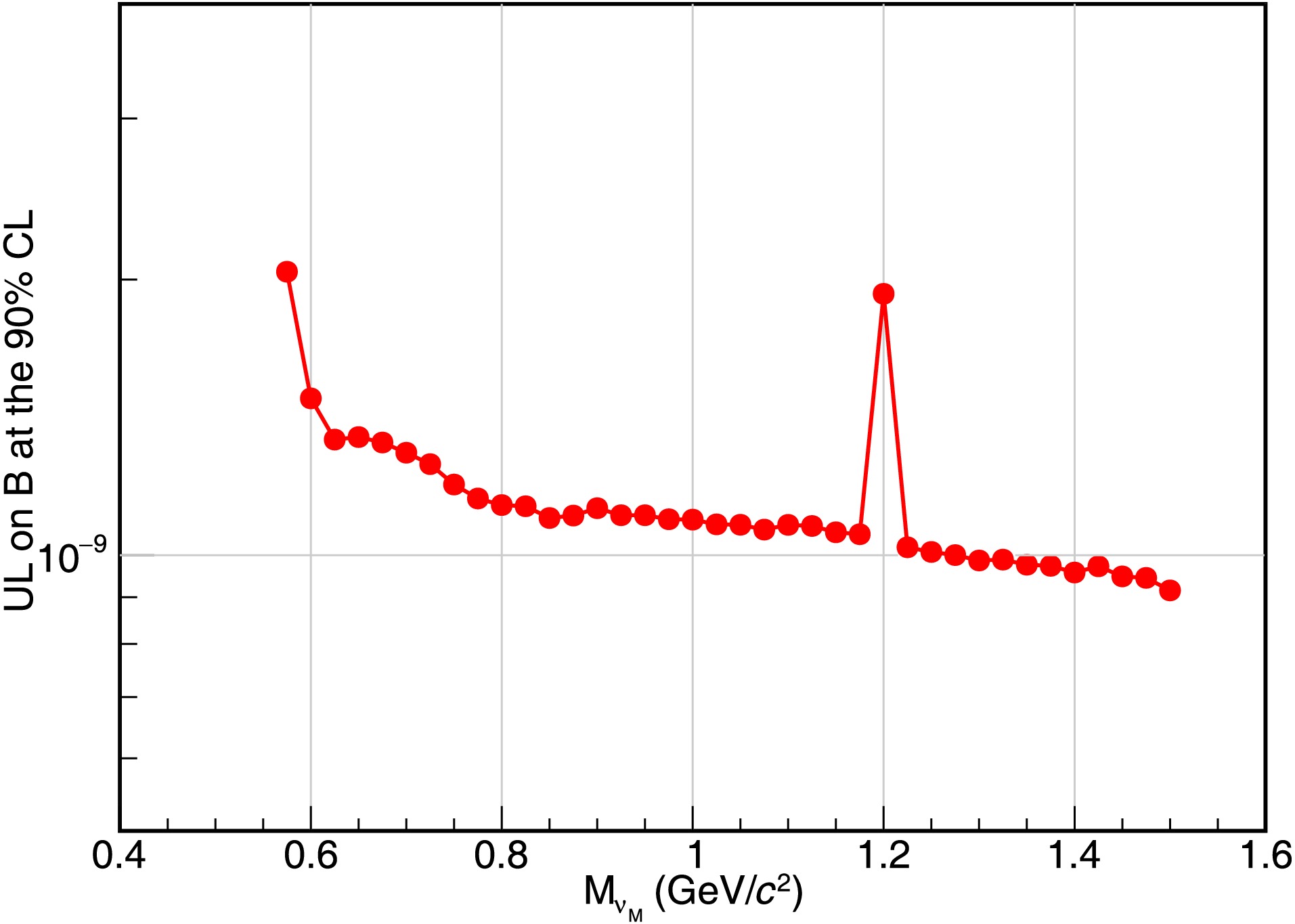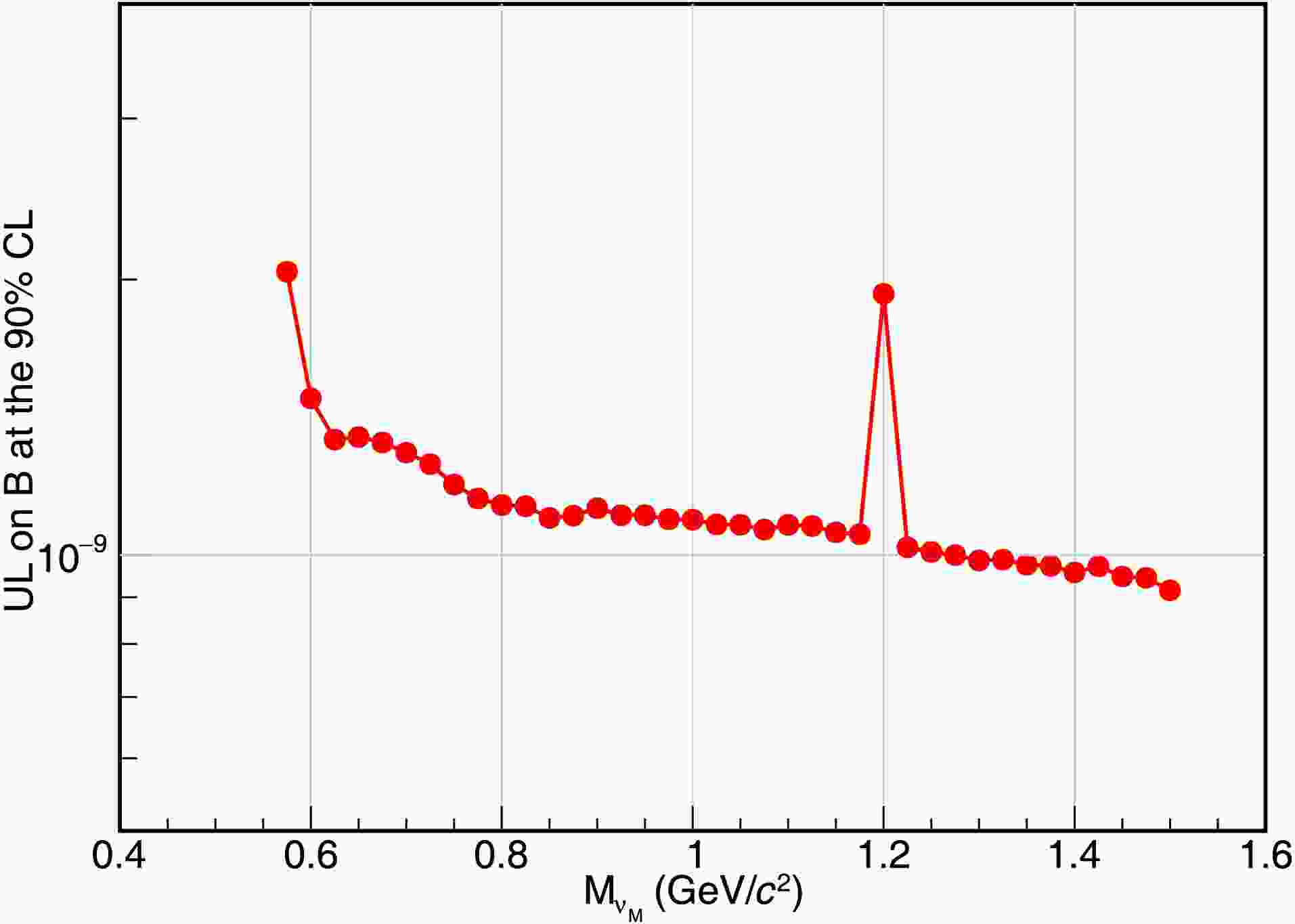 $ m_{Ke} $ bin. The mass dependent ULs are calculated to be from [2.04, 0.92]$ \times10^{-9} $ with the same method, and the results are shown in Fig. 4.$ m_{\nu_M} $ (GeV/
