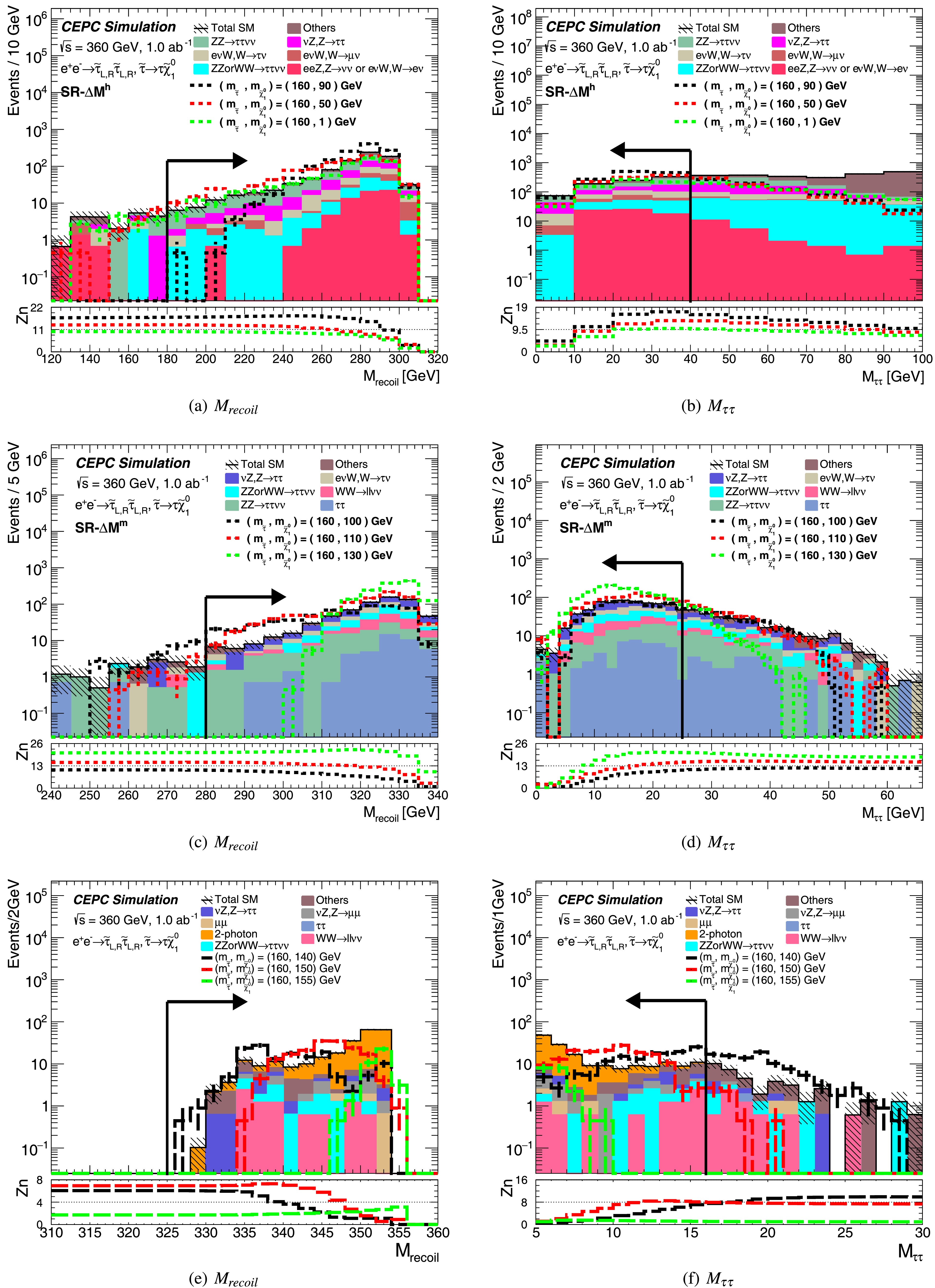 The Circular Electron Positron Collider (CEPC) is designed to operate at key center-of-mass energies: 91.2 GeV as a Z factory for precision Z boson studies, ≈ 160 GeV at the threshold for W boson pair production, and 240 GeV as a Higgs factory for copious Higgs boson production. It can be upgraded to 360 GeV (CEPC-360 GeV) for enabling top quark-antiquark (\begin{document}$ t\bar{t}$\end{document} ) pair production. Beyond enabling high-precision measurements of the Standard Model (SM), CEPC-360 GeV is uniquely positioned to perform searches for new physics beyond the SM (BSM), serving as a valuable complement to hadron colliders. This paper presents a sensitivity study on the direct pair production of staus and smuons at the CEPC with \begin{document}$ \sqrt{s}$\end{document} = 360 GeV, conducted via full Monte Carlo simulation. Under the assumptions of 1.0 ab−1 integrated luminosity and a flat 5% systematic uncertainty, CEPC-360 GeV could potentially discover the combined production of left-handed and right-handed staus up to a mass of 170 GeV (if they exist) or up to 169 for pure left-handed staus and 162 GeV for pure right-handed staus. For direct smuon production, the discovery potential reaches up to 178 GeV under the same conditions.