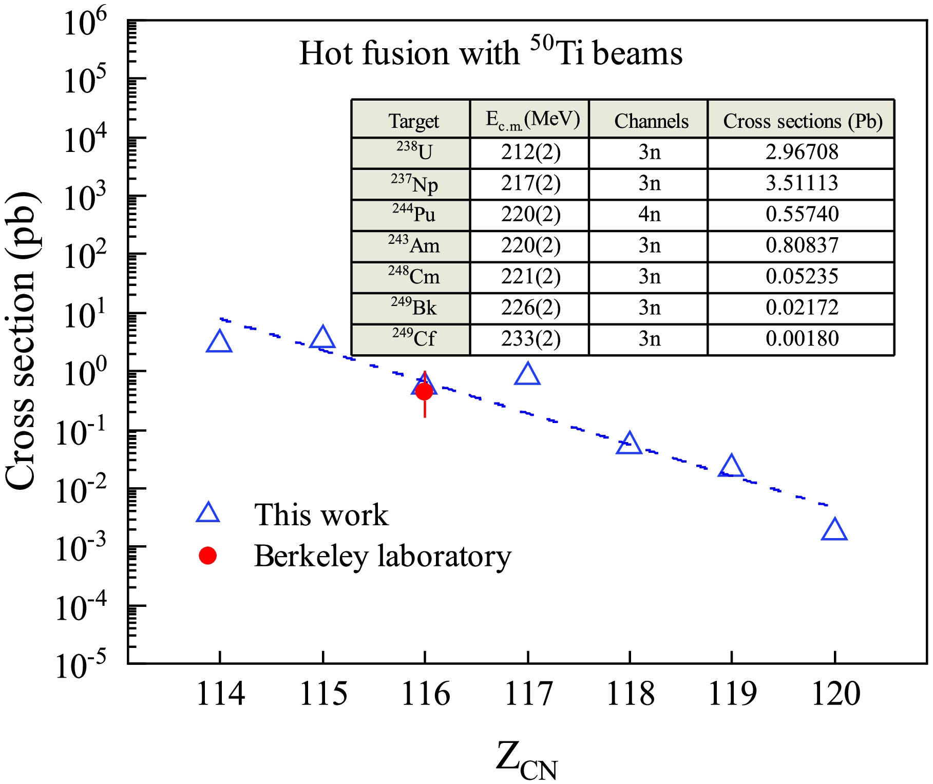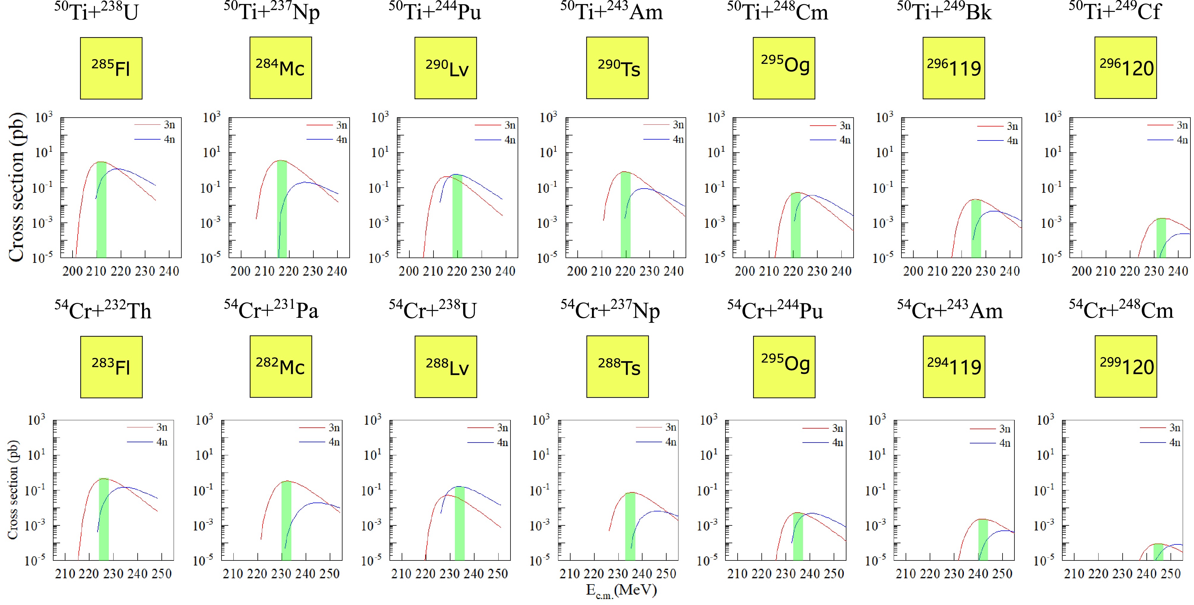 The theoretical study aims to synthesize superheavy elements with\begin{document}$ Z \geq 114 $\end{document} by irradiating an actinide target with a beam heavier than \begin{document}$^{48}\text{Ca}$\end{document} . The results of the \begin{document}$ \mathrm{^{244}Pu}(\mathrm{^{50}Ti}, \, \mathit{x} n)\, \mathrm{^{294-\mathit{x}}Lv} $\end{document} reaction are in good agreement with the experimental results first published by Lawrence Berkeley National Laboratory. The research indicates that reactions using \begin{document}$ \mathrm{^{50}Ti} $\end{document} have higher cross sections for the production of superheavy elements compared to reactions using \begin{document}$ \mathrm{^{54}Cr} $\end{document} . The production cross section for the \begin{document}$ \mathrm{^{249}Bk}(\mathrm{^{50}Ti}, \, \mathit{x} n)\, \mathrm{^{299-\mathit{x}}119} $\end{document} reaction is predicted to be \begin{document}$ \sigma_{\mathrm{prod}} = 21.72 $\end{document} fb at a center-of-target center-of-mass energy of 226(2) MeV, while for the \begin{document}$ \mathrm{^{249}Cf}(\mathrm{^{50}Ti}, \, \mathit{x} n)\, \mathrm{^{299-\mathit{x}}120} $\end{document} reaction, it is predicted to be \begin{document}$ \sigma_{\mathrm{prod}} = 1.80 $\end{document} fb at a higher center-of-target center-of-mass energy of 233(2) MeV. This suggests that with a \begin{document}$ \mathrm{^{50}Ti} $\end{document} beam, there is potential for synthesizing superheavy elements near the island of stability, as well as new elements beyond \begin{document}$ Z = 118 $\end{document} .
