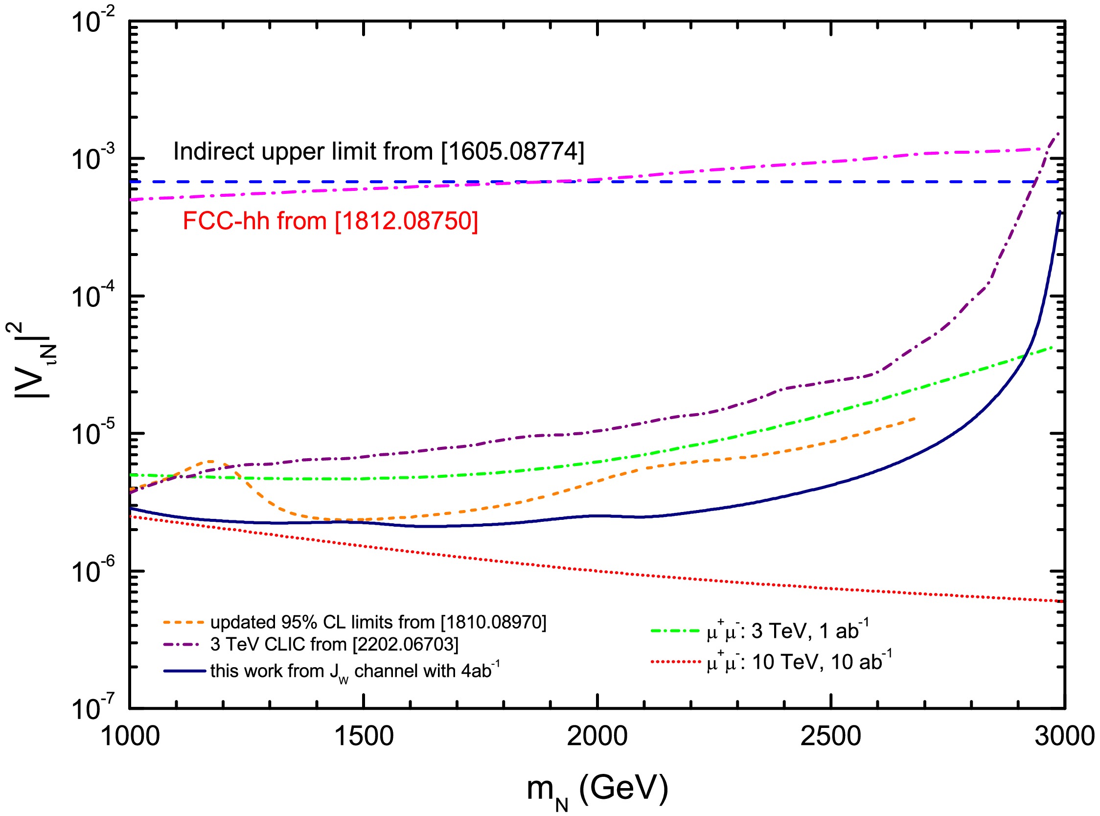 Heavy Majorana neutrinos (N) are predicted in many models of physics beyond the Standard Model. In this work, we explore the production and detection prospects of TeV-scale heavy neutrinos (\begin{document}$ m_N \gtrsim 1 $\end{document} TeV) at a future 3 TeV Compact Linear Collider (CLIC). We focus on two distinct decay topologies: (i) \begin{document}$ N \to \ell^\pm W^\mp $\end{document} with hadronic W boson decay, leading to a final state with one charged lepton and a hadronic fat jet \begin{document}$ J_W $\end{document} ; and (ii) \begin{document}$ N \to \nu h $\end{document} with subsequent Higgs decay \begin{document}$ h \to b\bar{b} $\end{document} , yielding a Higgs-tagged fat jet \begin{document}$ J_h $\end{document} and \begin{document}$\not{E}_T$\end{document} . Based on comprehensive detector-level simulations and background analysis, we present both \begin{document}$ 2\sigma $\end{document} exclusion limits and \begin{document}$ 5\sigma $\end{document} discovery reaches in the \begin{document}$ m_N $\end{document} –\begin{document}$ |V_{\ell N}|^2 $\end{document} plane. We further extract 95% confidence level upper limits on the mixing parameter \begin{document}$ |V_{\ell N}|^2 $\end{document} and perform a detailed comparison with existing constraints from direct searches at future colliders and indirect global fits. Our findings demonstrate that a 3 TeV CLIC can improve the sensitivity to \begin{document}$ |V_{\ell N}|^2 $\end{document} by about two orders of magnitude compared with the projected reaches of future hadron colliders while remaining competitive with other CLIC search channels.
