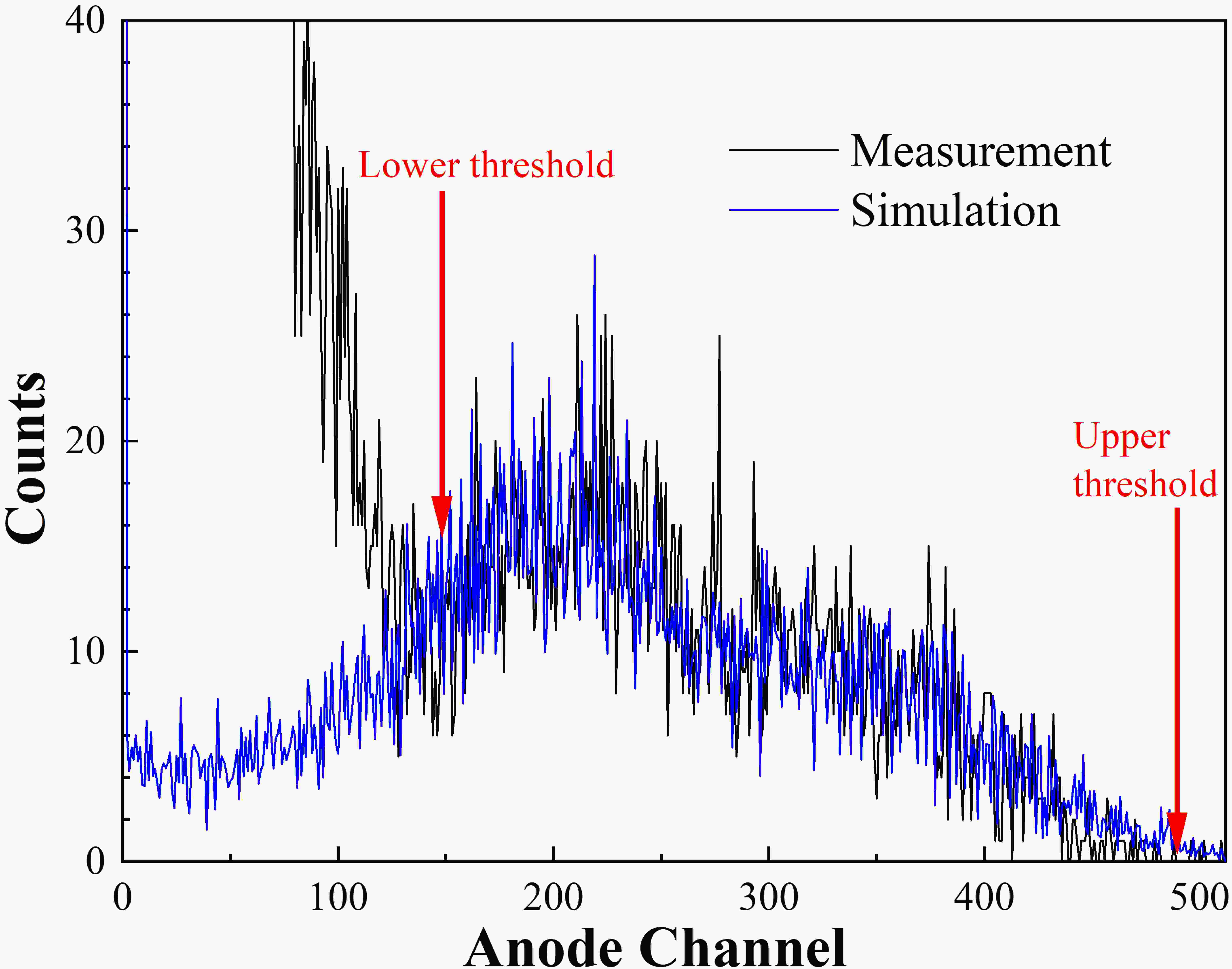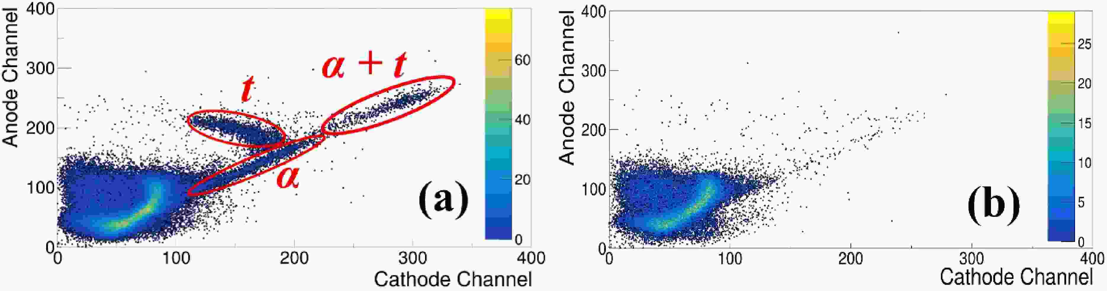 As shown in Fig. 2, when the gas pressure is 1.0 atm, all α particles can deposit their energy at the sensitive volume of the GIC. Therefore, the α events can be well identified. For triton, only a small part of energy can be detected by the GIC because of the long range. In the two–dimensional spectrum, triton events are located at the area with an anode energy below 4 MeV and cannot be separated from the background. When the gas pressure is 4.0 atm, all α particles and tritons can deposit their energy at the GIC, as shown in Fig. 3. Owing to the higher gas pressure, the range of α particles is very short and the cathode energy is almost the same as the anode energy for α events, which means that the α events show a line shape inclined at 45 degrees at the two–dimensional spectrum. The triton events with different emitting angles hold different energies, which makes the triton events exhibit a narrow distribution in the two–dimensional spectrum.