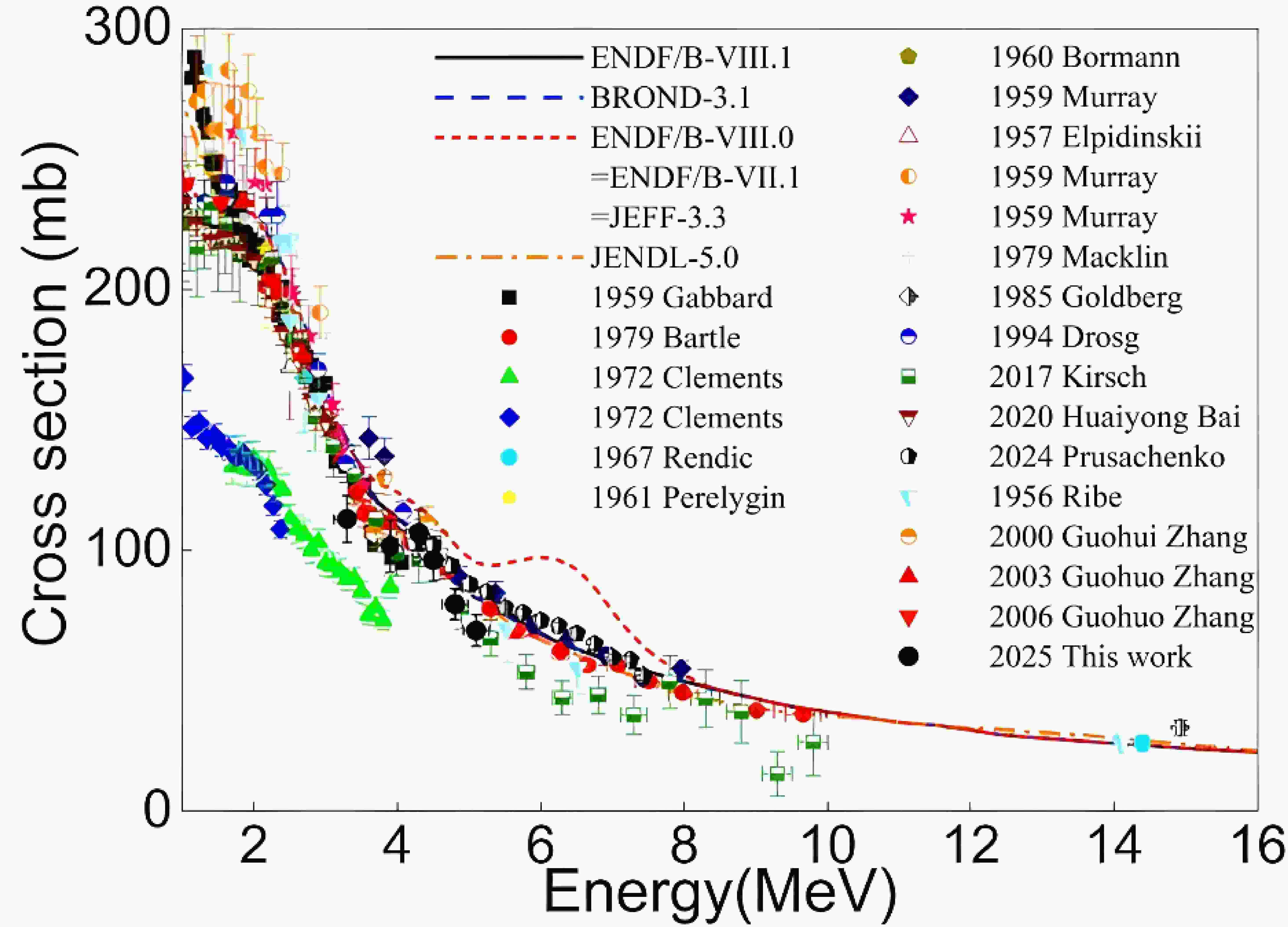 Our results are consistent with recent measurements, such as those by Kirsch [19] and Prusachenko [20], and they follow the expected decreasing trend in cross section with increasing neutron energy. In comparison with major nuclear data libraries–JEFF–3.3, ENDF/B–VIII.0, ENDF/B–VIII.1, JENDL–5.0, and BROND–3.1–our results showed that ENDF/B–VIII.1 and JENDL–5.0 exhibited the closest agreement across the 3.3–5.1 MeV range, particularly around 4.5 MeV. In contrast, JEFF–3.3 and ENDF/B–VII.1/VIII.0 systematically overestimated the cross section by approximately 15%–30% in this region. BROND–3.1 showed better agreement with our data above 4.3 MeV, indicating improved accuracy in this energy range.
