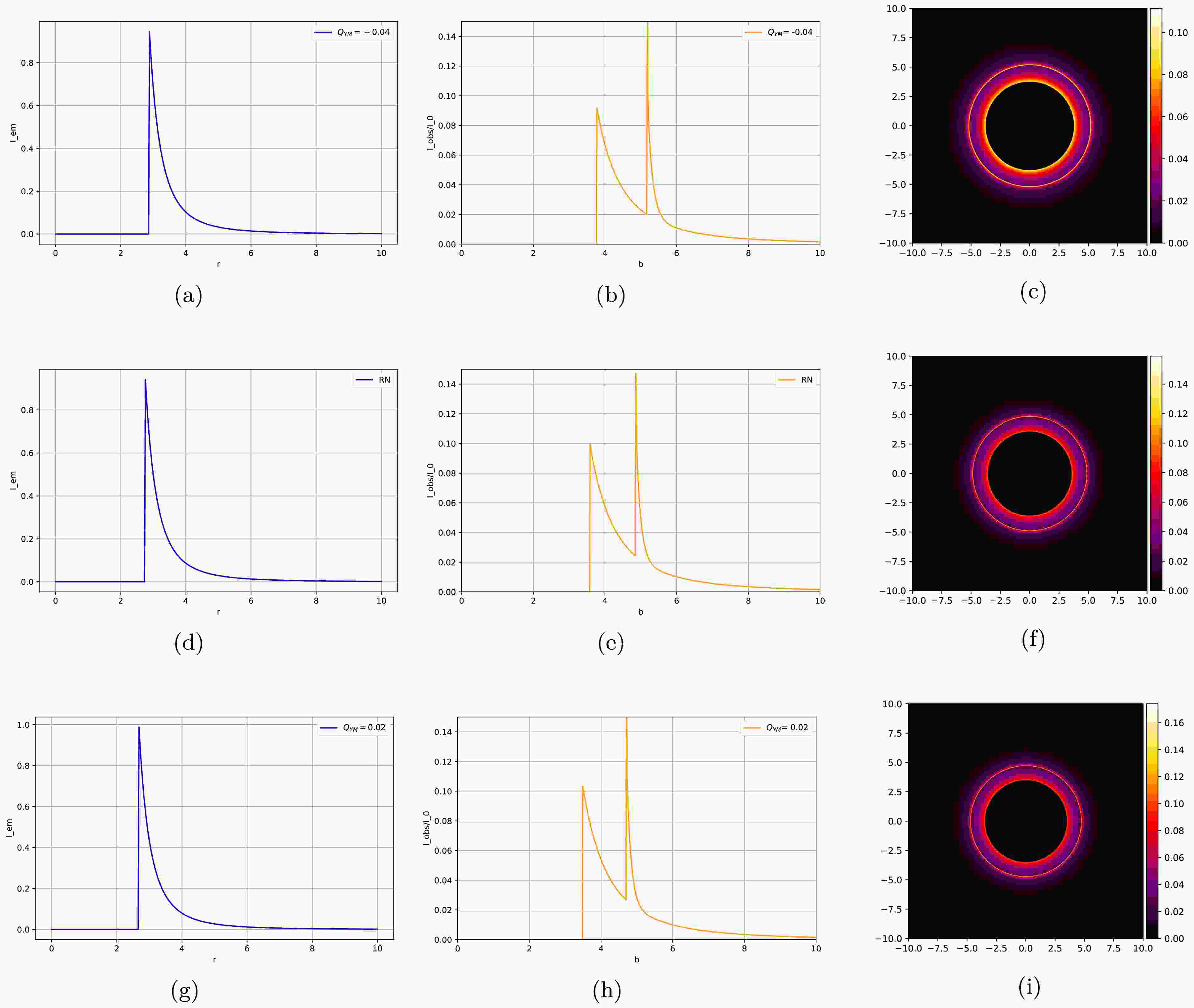$ Q_{\rm YM} $ takes values of$ -0.04 $ ,$ 0 $ , and$ 0.02 $ . The first column shows the emission intensity$ I_{\rm em2}(r) $ , the second column presents the total intensity$ I_{\rm obs}(b) $ observed by the observer, and the third column displays the optical appearance seen by the observer.