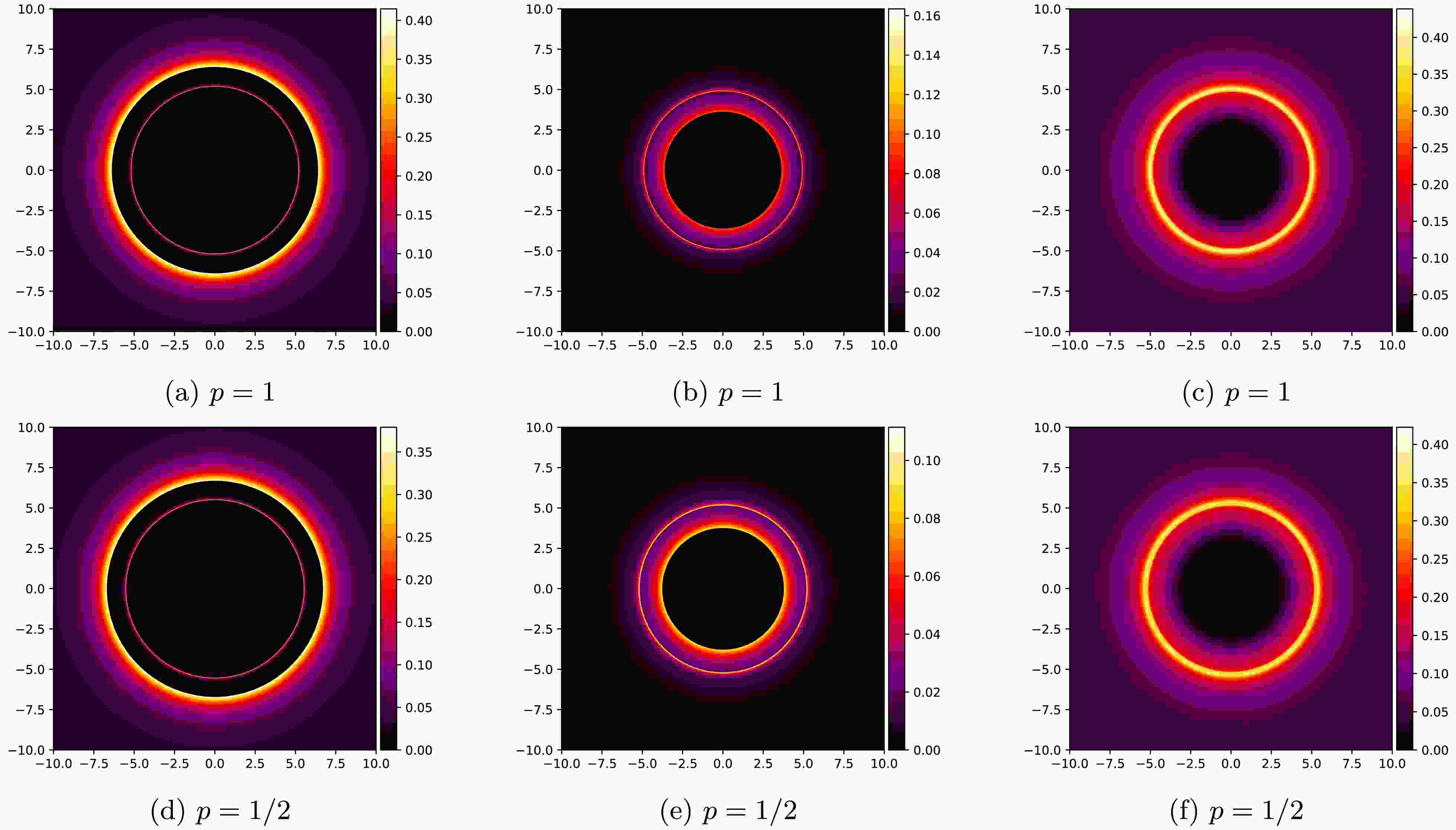 $ p=1 $ ) and (d-f) power-law ($ p=1/2 $ ) Yang-Mills black holes with$ Q=0.6 $ and$ Q_{\rm YM}=-0.04 $ . Columns represent three distinct emission models.As shown in Fig. 13, the optical appearance between the power-law Yang-Mills and standard Yang-Mills black holes is significantly different: the photon ring radius of the former is slightly larger, which is consistent with the parameter calculation results presented earlier. The introduction of the power-law term leads to changes in all relevant optical parameters. This result indicates that the power parameter not only affects the spacetime structure of the black hole but also plays an important role in the imaging and observation of the shadow of the Einstein Maxwell power-Yang-Mills hairy black hole. This exhibits characteristics consistent with those observed in the uncharged power-law Yang-Mills black holes studied in the literature [56].