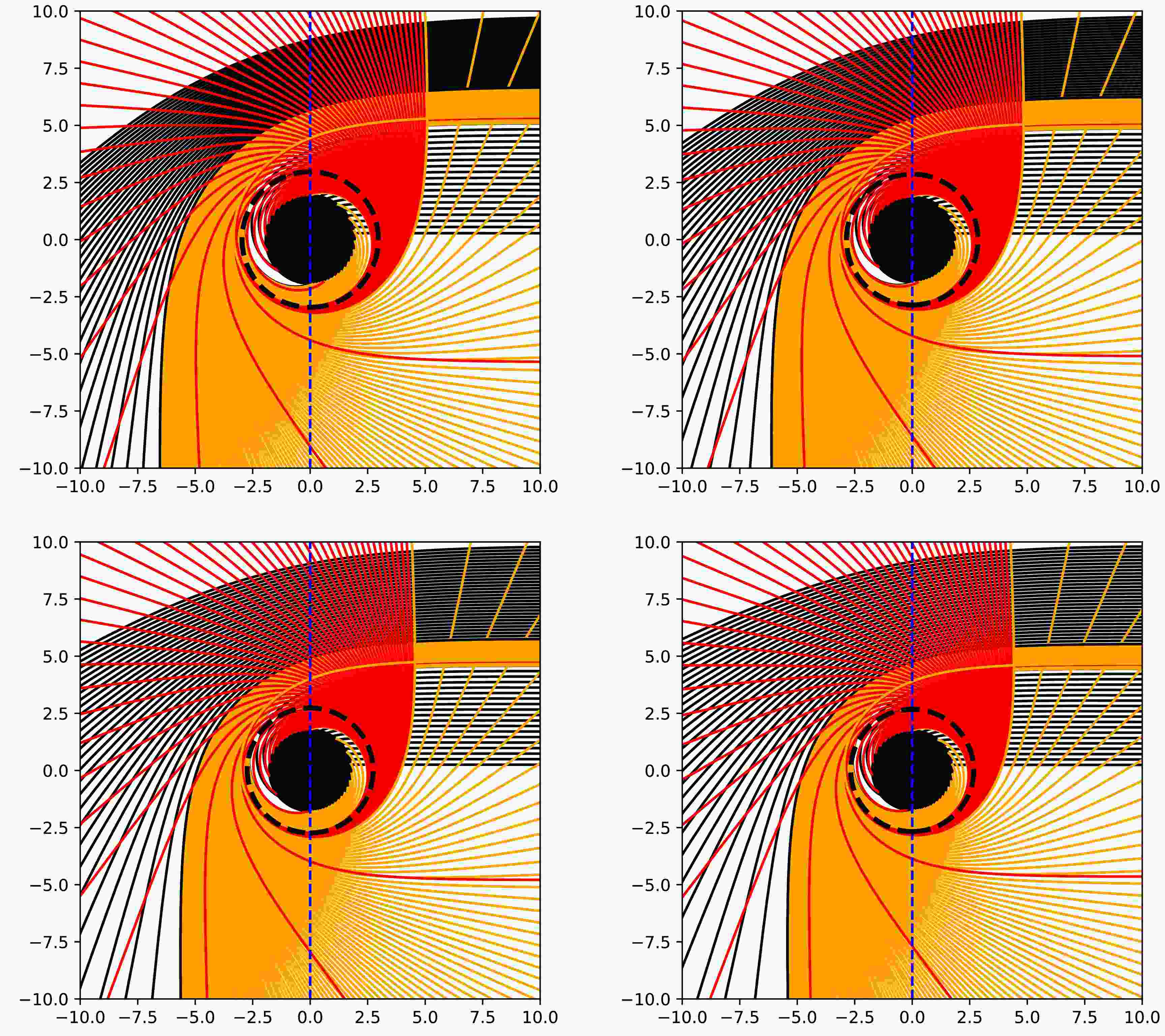 $ Q_{\rm YM} $ :$ -0.07 $ (top-left),$ -0.04 $ (top-right),$ 0 $ (bottom-left), and$ 0.02 $ (bottom-right). The black disc represents the black hole region within the event horizon, and the black dashed line indicates the unstable photon sphere radius. The observer is located at the North Pole at a large distance from the black hole. The curved lines depict photon geodesic trajectories, with colors indicating their types: black for geodesics intersecting the accretion disk once, orange for those intersecting twice, and red for those intersecting more than three times.Fig. 8 shows the following: