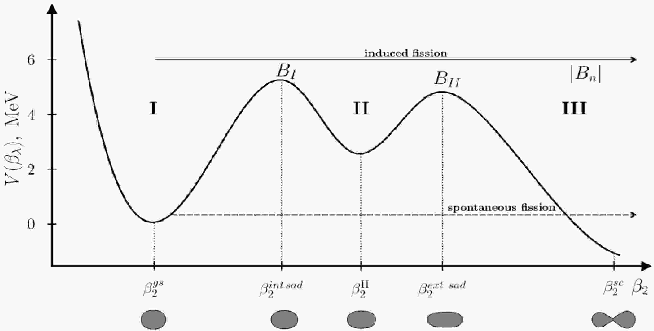 $V$ as a function of the quadrupole deformation of the nucleus${\beta _2}$ . Region I corresponds to the ground state of the nucleus with$\beta _2^{gs}$ , II to the isomeric states, and III to the out-of-barrier region where the nucleus decays into fission fragments.$ {B_I} $ refers to the internal barrier,$ {B_{II}} $ refers to the external barrier.The parameters of forced threshold fission of CFS are described through two fundamental postulates outlined in the theoretical model [4]. The first postulate states asserts that the axial symmetry of the CFS is preserved during the fission process. This assumption is supported by empirical data demonstrating a high degree of fission symmetry in numerous of experimental studies. The second postulate posits that the projection