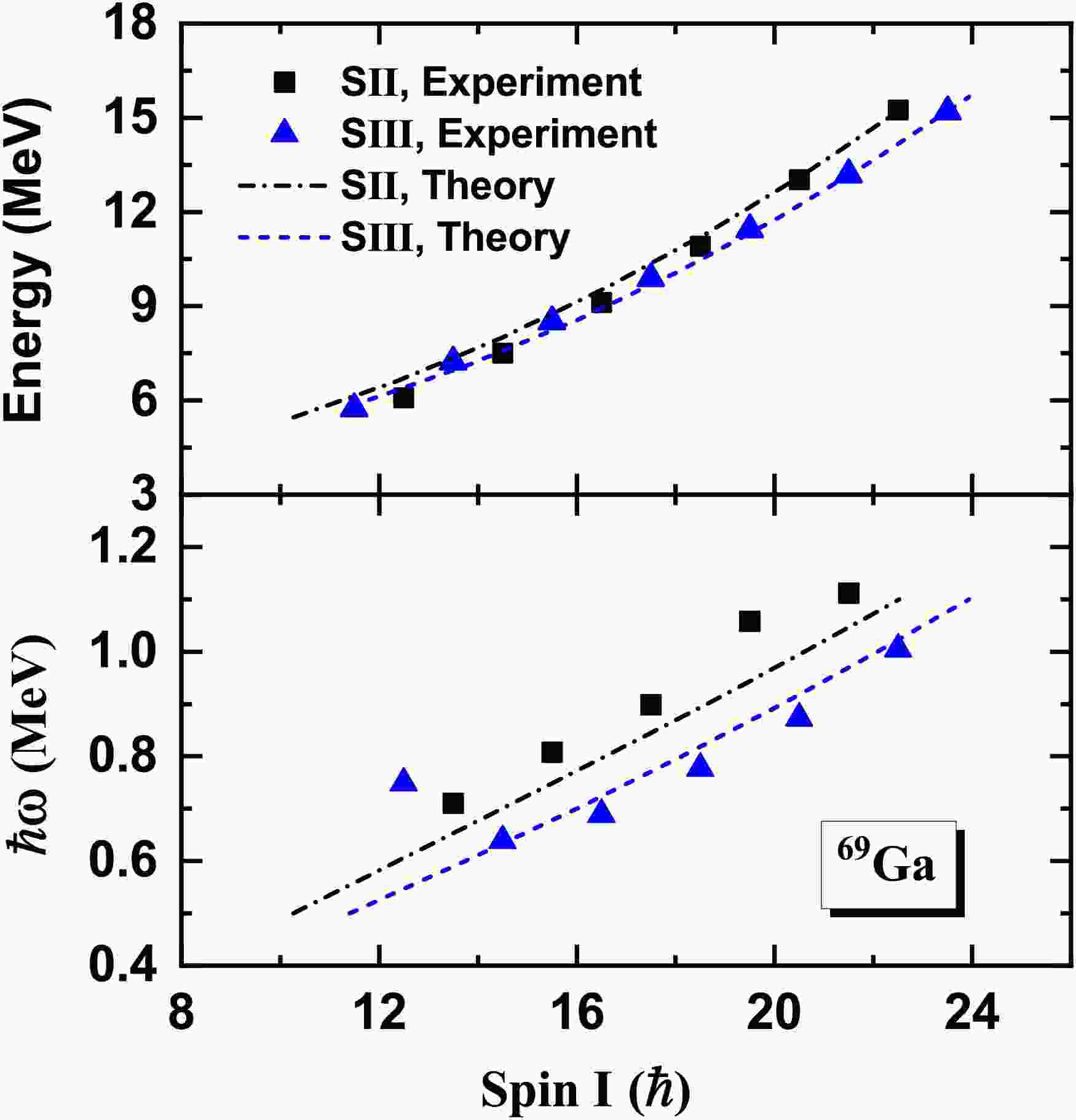 $ Z=28 $ closed shell, the odd-mass Ga isotopes present a diverse spectral structures and has caught much attention [17−20]. Many experimental efforts have been devoted to measure the spectra of 69Ga since 1956 [21]. These investigations reported various low-lying negative-parity states generated by single-particle excitations involving$ 1f_{5/2} $ ,$ 2p_{3/2} $ ,$ 2p_{1/2} $ and$ 1f_{7/2} $ orbitals [22−26]. Very recently, through the$ ^{26}\text{Mg}(^{48}\text{Ca},p4n\gamma) $ multi-nucleon transfer reaction, the negative-parity level scheme of 69Ga has been considerably extended. In addition, three positive-parity bands, namely bands SI, SII, and SIII, were observed[27], and better understanding for their nature necessitates the further theoretical studies.Theoretically, the spectroscopic properties of nuclei in the