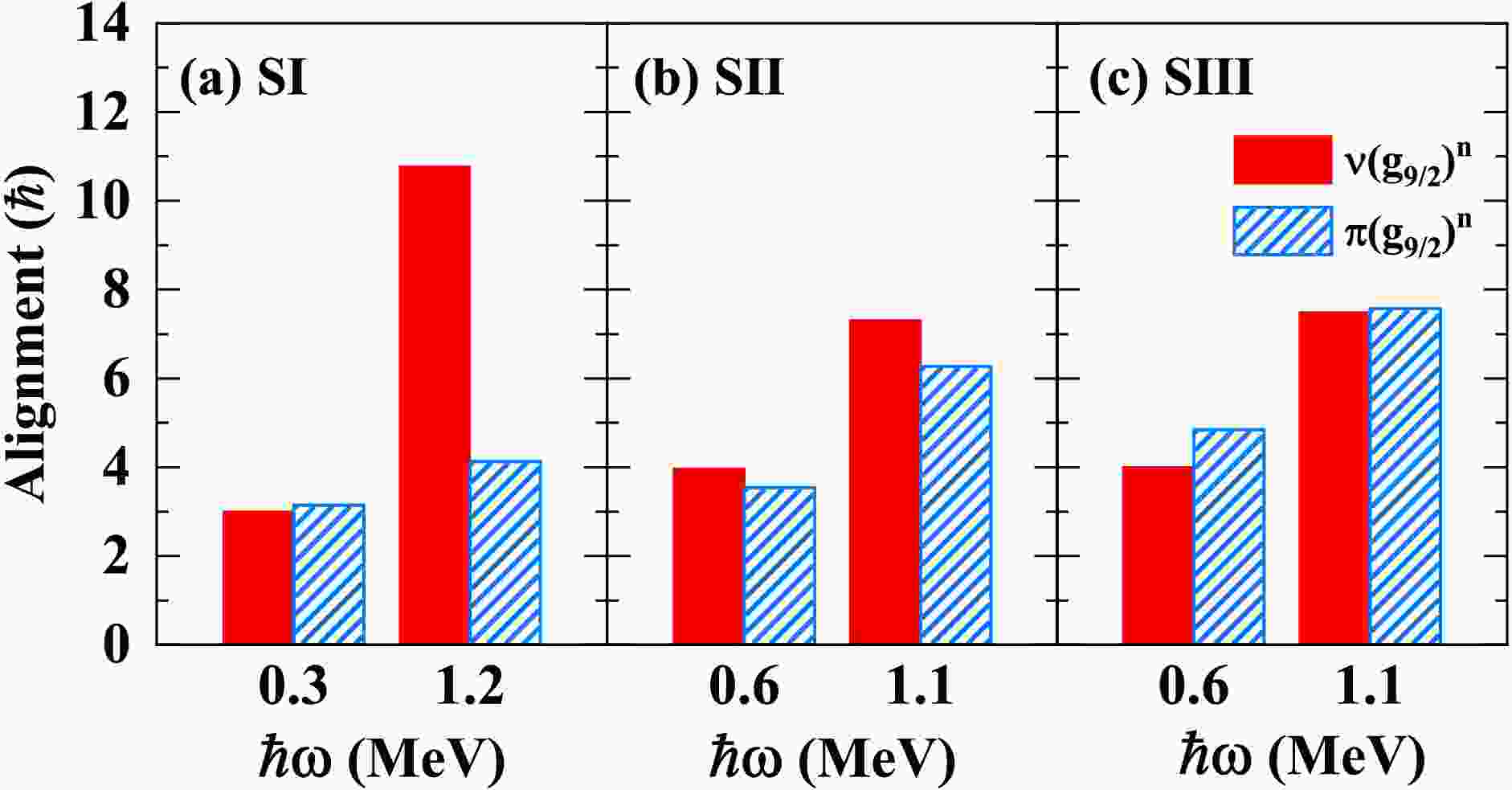 $ \hbar\omega = 0 $ MeV are listed in Table 1. The configuration$ \nu(g_{9/2})^4(pf)^6\otimes \pi(g_{9/2})^1(pf)^2 $ is assigned to band SI. The configuration$ \nu(g_{9/2})^4(pf)^6\otimes\pi(g_{9/2})^3 $ with positive and negative signatures is assigned to bands SII and SIII, respectively. Both configurations involve several valence$ g_{9/2} $ protons and neutrons that would induce nuclear collective rotations. The γ deformations for these two configurations are zero, and the corresponding β deformations are large. The particle nature of these configurations generates principal axis rotations, which are consistent with the$ \Delta I=2 $ character of the bands under consideration.Band E (MeV) β γ Configuration SI −596.2 0.41 $0.0^{\circ}$