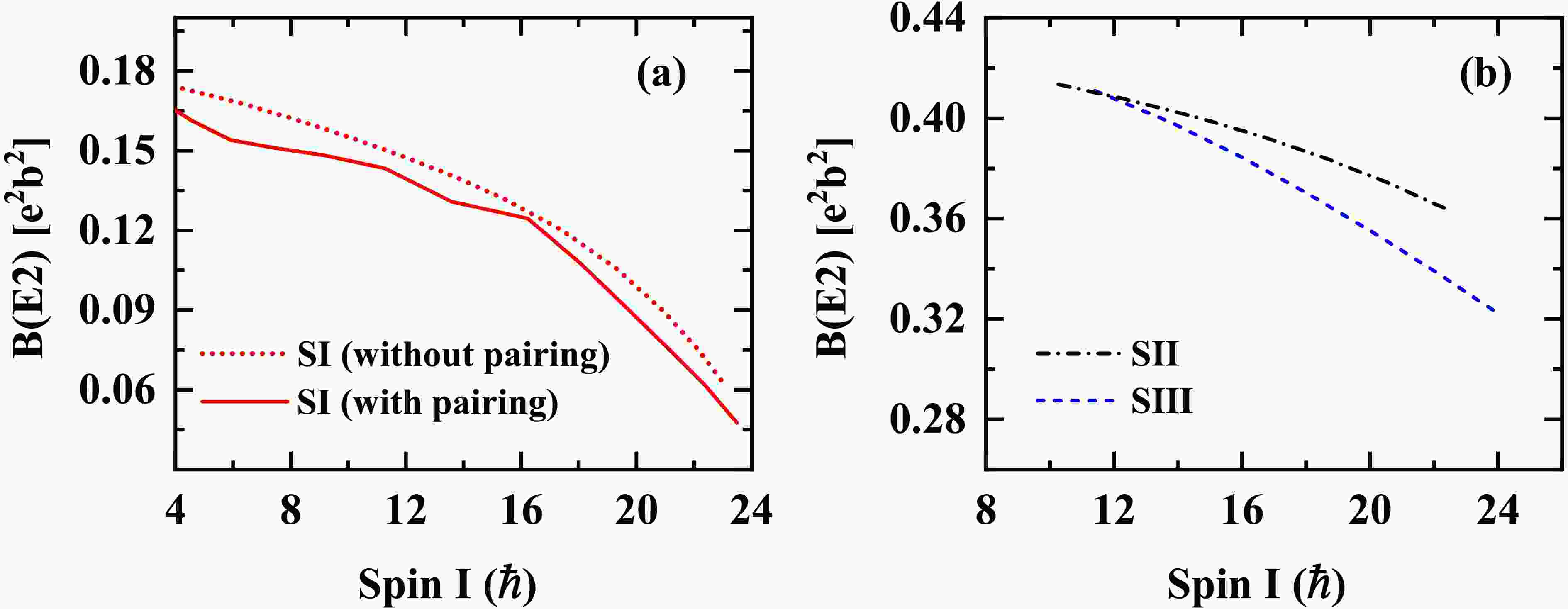 $ B(E2) $ values exhibit a decreasing tendency for all these bands. This is caused by the fact that their deformation parameters β decrease with the total angular momenta. For band SI, when taking into account the pairing correlations, the$ B(E2) $ values are slightly reduced. For the signature partner bands SII and SIII, the calculated$ B(E2) $ values are close at spin$ I \approx 23/2\hbar $ . At higher spins, however, the$ B(E2) $ values of band SII become larger than those of band SIII. Future experimental efforts including the measurement of lifetimes of these states are required to validate our predictions. -