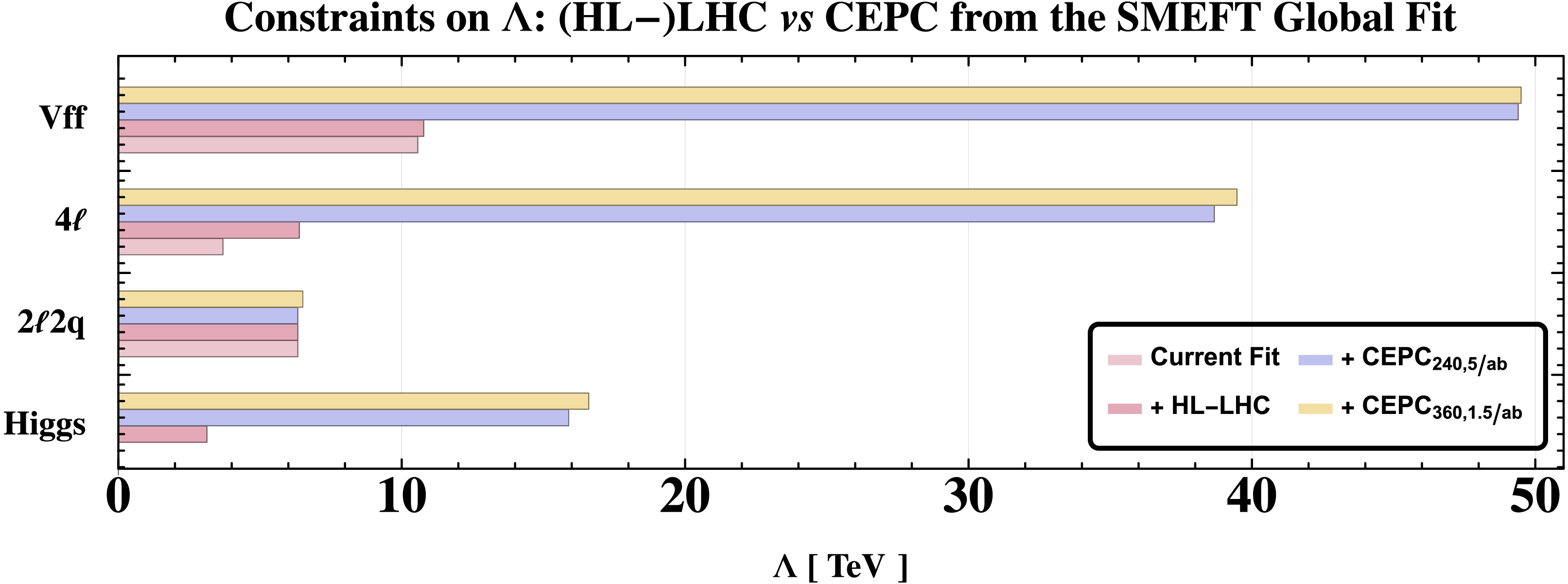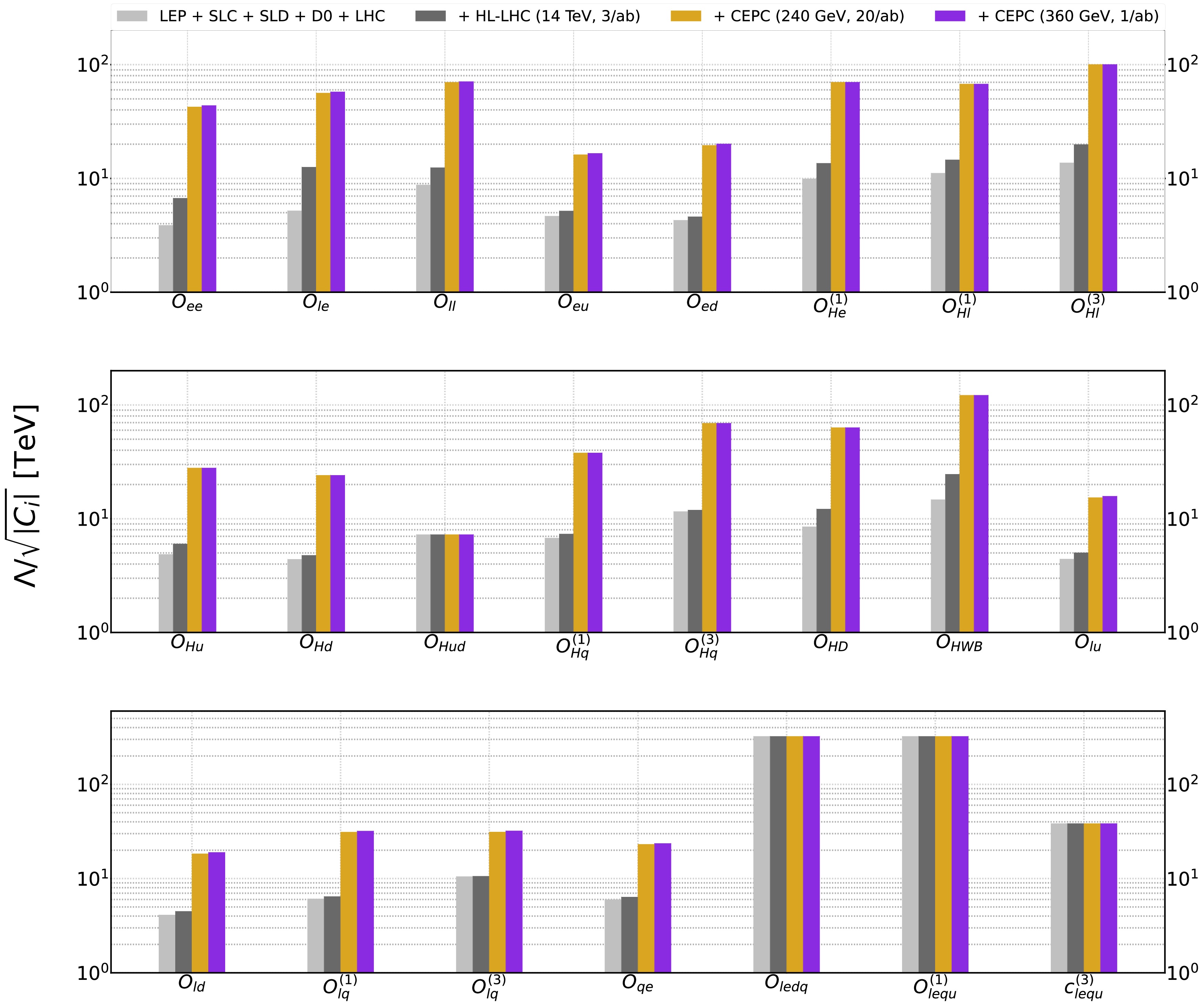 $ 1\sigma $ relative uncertainties are shown for the LHC, HL-LHC, and CEPC with the center of mass energy$ \sqrt s = 240\,(360){\rm\,GeV} $ and the integrated luminosity$ {\cal L} = 20\,(1){\rm\,ab^{-1}} $ . Fig. 94 clearly shows that CEPC can improve the Higgs couplings by a factor of a few, or even orders of magnitude as can be seen, for example, for the triple gauge couplings$ \delta g_{1,Z} $ ,$ \delta \kappa_\gamma $ , and$ \lambda_Z $ . The sensitivity reach of CEPC to leptonic electroweak vertices can be generically reduced down below the unprecedented$ 10^{-4} $ level as shown in the first row of Fig. 95, thanks to the high-luminosity of CEPC and radiative return to the Z pole from initial state radiation. The corresponding sensitivity to the hadronic electroweak vertices can also be improved by a few, or even an order of magnitude better as for$ \delta g_{Z,L/R}^{bb} $ for instance. For the 4-fermion operators, CEPC can generically reduce the current uncertainties, as shown explicitly in the last five rows of figures 95. In particular, for the semi-leptonic operators, the global fit results with the inclusion of CEPC can be improved by$ {\cal{O}}(10\sim10^2) $ for the 2nd and 3rd generation quarks due to tagging efficiencies of heavy quarks at CEPC. These stronger constraints as expected for CEPC will on the other hand also impose new challenges on the theoretical side, for example, theoretical uncertainties on the effective number of relative species during neutrino decoupling in the early Universe [776, 777]. These current theoretical errors will have to be further reduced at the CEPC era to match the precision of CEPC. In summary, CEPC can dramatically increase the sensitivity to Higgs, electroweak, and 4-fermion operators thanks to its high energy and luminosity, and as a result, enhancing its ability in discovering new physics at the 10$ \sim $ 70 TeV scale that could show up in either the Higgs, electroweak, or the 4-fermion sector as seen in the summary plot of Fig. 96. For reference, the lower bounds on the new physics scale$ \Lambda/\sqrt{|C_i|} $ are also shown in Fig. 97 by switching to the Warsaw basis [772] and at the 95% CL. To obtain these results, we assume flavor universality and one operator at a time. In this figure, the light gray bar represents the constraints from the current data with the inclusion of$ A_{FB} $ for neutral Drell-Yan processes at the LHC [778], and the gray bar that with the inclusion of$ A_{FB} $ at the HL-LHC [779]. The last two bars correspond to the sensitivity of CEPC with$ \sqrt s= 250 $ GeV and 360 GeV, respectively. In general, we find it feasible for CEPC to improve the new physics scale by a factor of 3$ \sim $ 10 except for the$ O_{Hud} $ ,$ O_{ledq} $ ,$ O_{lequ}^{(1)} $ and$ O_{lequ}^{(3)} $ operators due to missing projections from the CKM unitarity and flavor physics. Finally, we comment on the global analysis of bosonic CP violating SMEFT operators at dimension 6, which will be important to understand the origin of matter-antimatter asymmetry of our Universe. In [775], it was shown that CEPC could provide a complementary probe compared with that from the (HL-)LHC, and the new physics scale can be constrained to be above$ \sim2.5 $ TeV. Furthermore, recent analyses in [780, 781] based on the angular distribution of$ e^+e^-\to Z \gamma $ with subsequent hadronic and leptonic Z decay found that CEPC could even constrain the CP-violating dimension-8 SMEFT operators to be around$ \sim1 $ TeV, assuming one operator at a time and a center of mass energy at 250 GeV and an integrated luminosity of 5$ {\rm ab}^{-1} $ . This highlights the opportunity of studying CP violation at the CEPC.