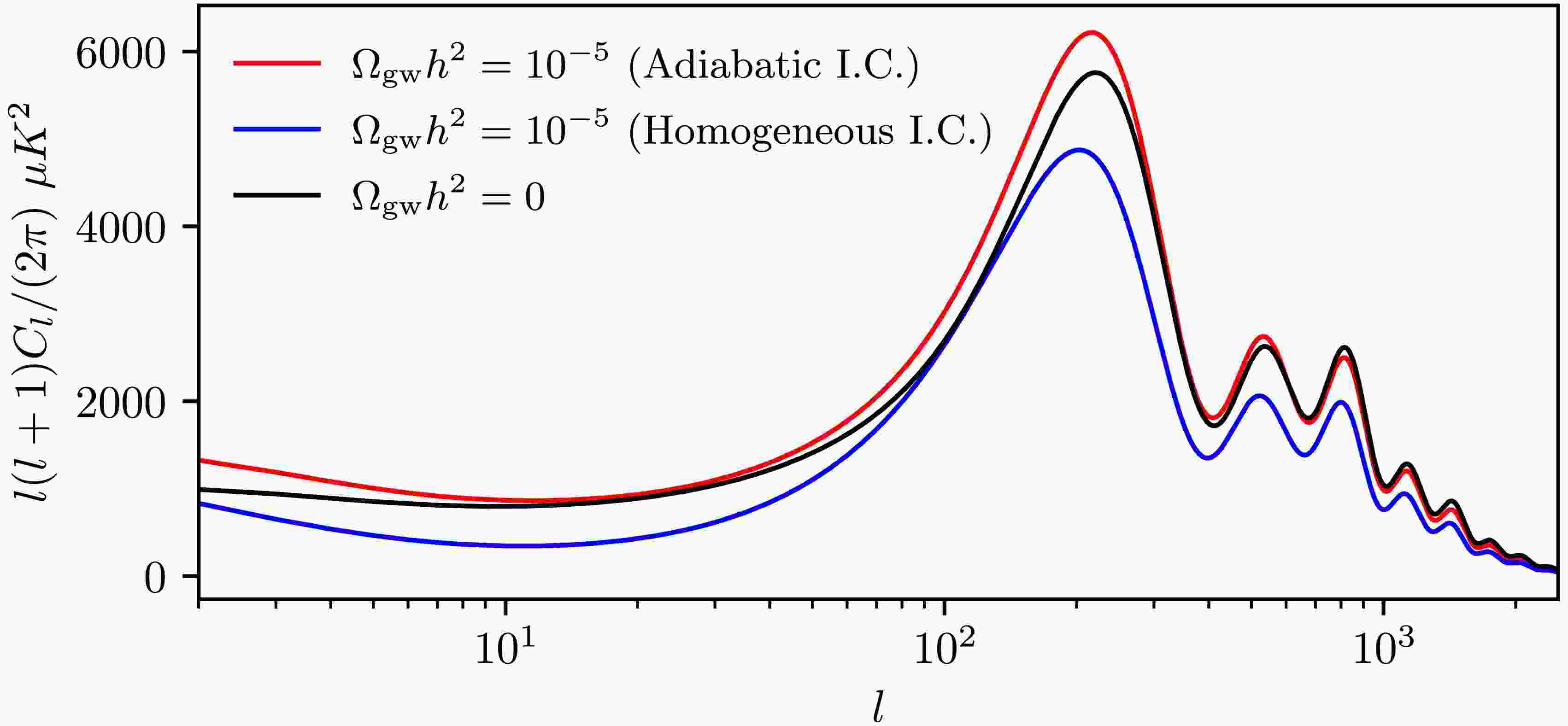 $ \Omega_{\rm gw}h^{2} $ compared to adiabatic initial conditions. This could be attributed to the fact that while adiabatic gravitational waves enhance the total power of cosmological perturbations, their homogeneous counterparts suppress it, as demonstrated in Fig. 1. Physically, under homogeneous initial conditions, gravitational-wave perturbations and photon perturbations evolve out of phase within the horizon due to their initial conditions having opposite signs. -